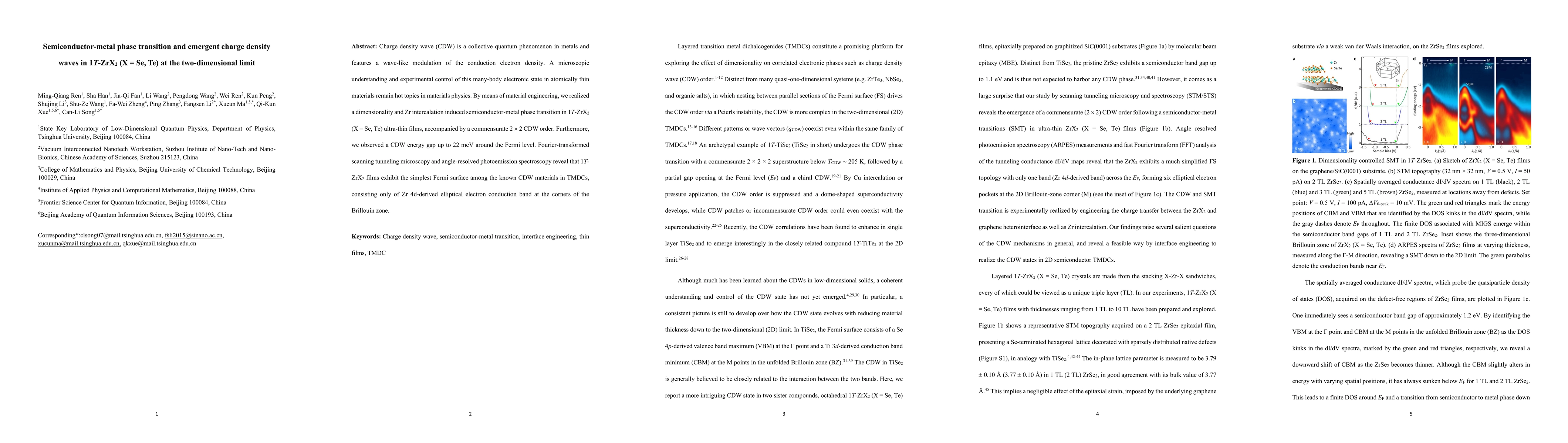 This paper investigates the semiconductor-metal phase transition and emergent charge density waves in ultra-thin 1T-ZrX$_2$ (X = Se, Te) films, revealing a commensurate 2 $\times$ 2 CDW order and a CDW energy gap of up to 22 meV, with the simplest Fermi surface among known CDW materials.