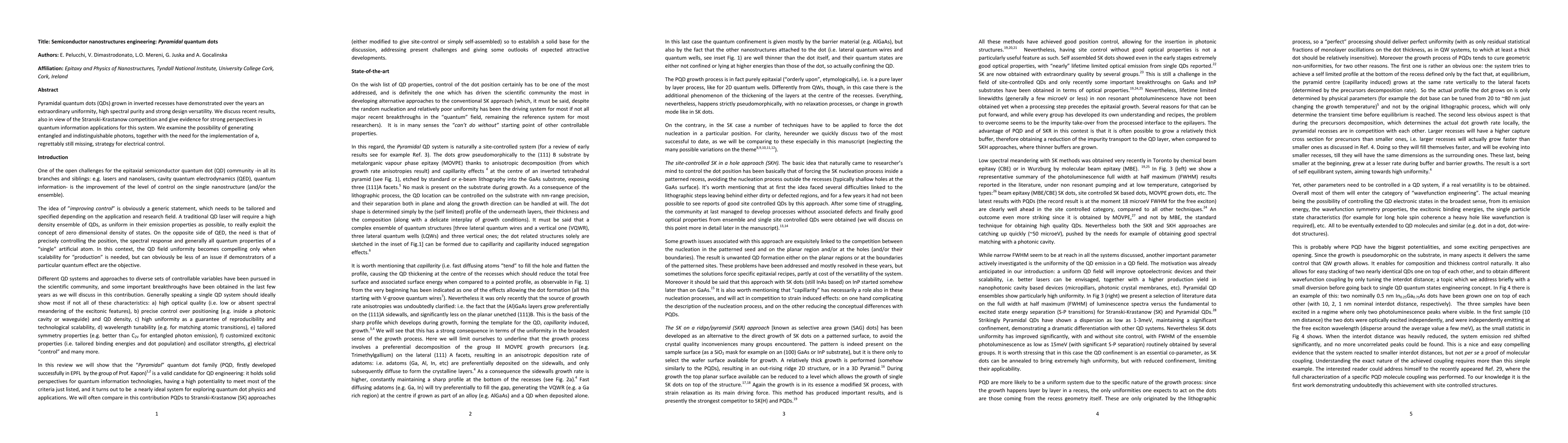 This paper explores the engineering of pyramidal quantum dots, highlighting their uniformity, spectral purity, and versatility. It discusses potential applications in quantum information, including the generation of entangled photons, while noting the need for an electrical control strategy.