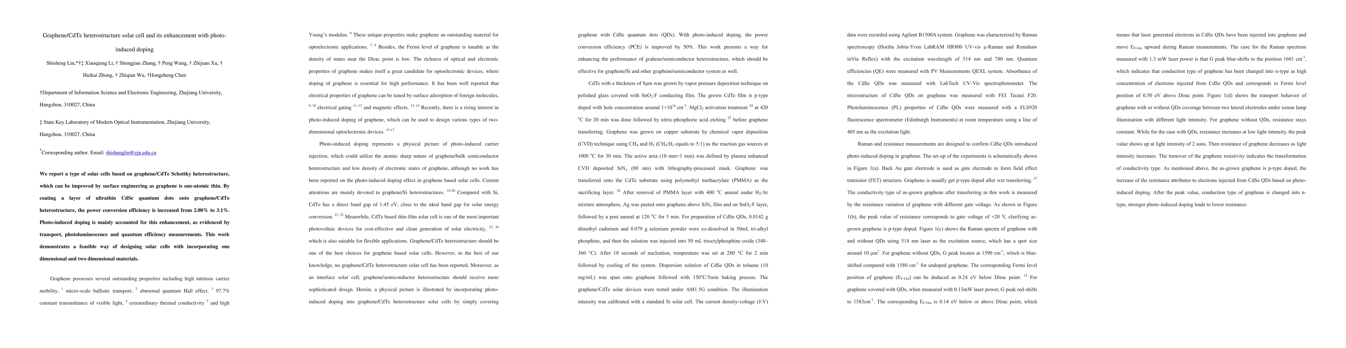 This paper presents a graphene/CdTe heterostructure solar cell enhanced by ultrathin CdSe quantum dots, increasing its power conversion efficiency from 2.08% to 3.1% through photo-induced doping, showcasing a promising method for integrating 1D and 2D materials in solar cell design.