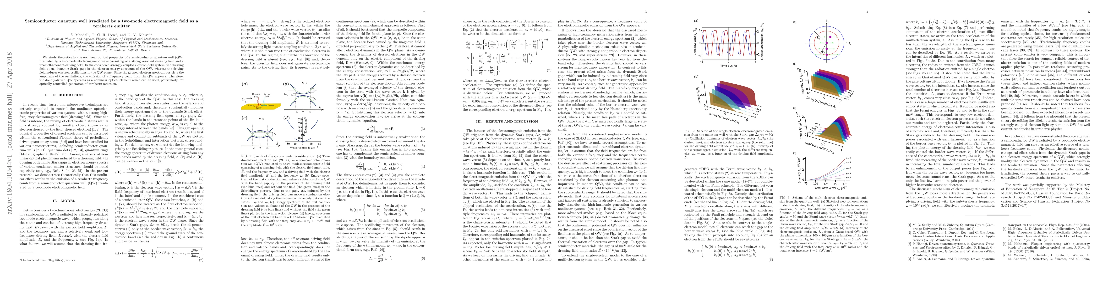 We study theoretically the nonlinear optical properties of a semiconductor quantum well (QW) irradiated by a two-mode electromagnetic wave consisting of a strong resonant dressing field and a weak off-resonant driving field. In the considered strongly coupled electron-field system, the dressing field opens dynamic Stark gaps in the electron energy spectrum of the QW, whereas the driving field induces electron oscillations in the QW plane. Since the gapped electron spectrum restricts the amplitude of the oscillations, the emission of a frequency comb from the QW appears. Therefore, the doubly-driven QW operates as a nonlinear optical element which can be used, particularly, for optically controlled generation of terahertz radiation.