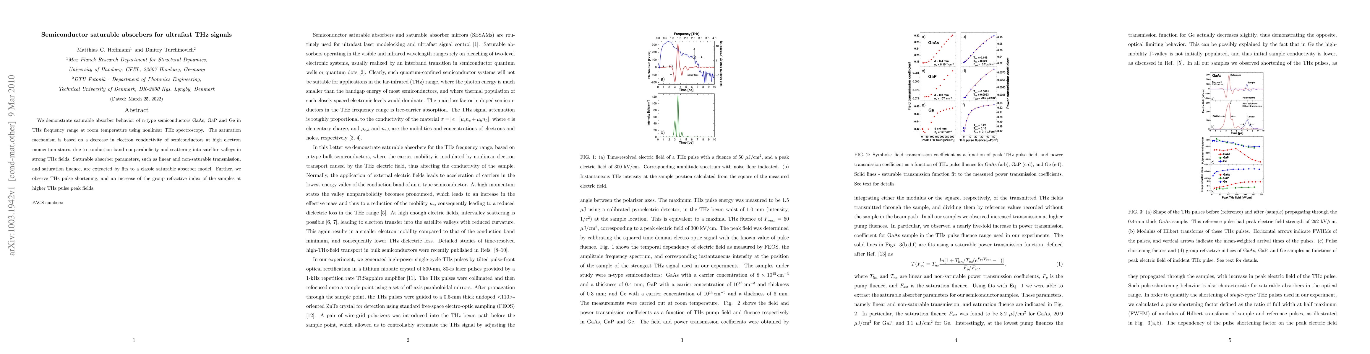 This paper demonstrates the saturable absorber behavior of n-type semiconductors GaAs, GaP, and Ge in the THz frequency range, attributing the saturation mechanism to electron conductivity changes under strong THz fields. The study also observes THz pulse shortening and increased group refractive index with higher peak THz fields.