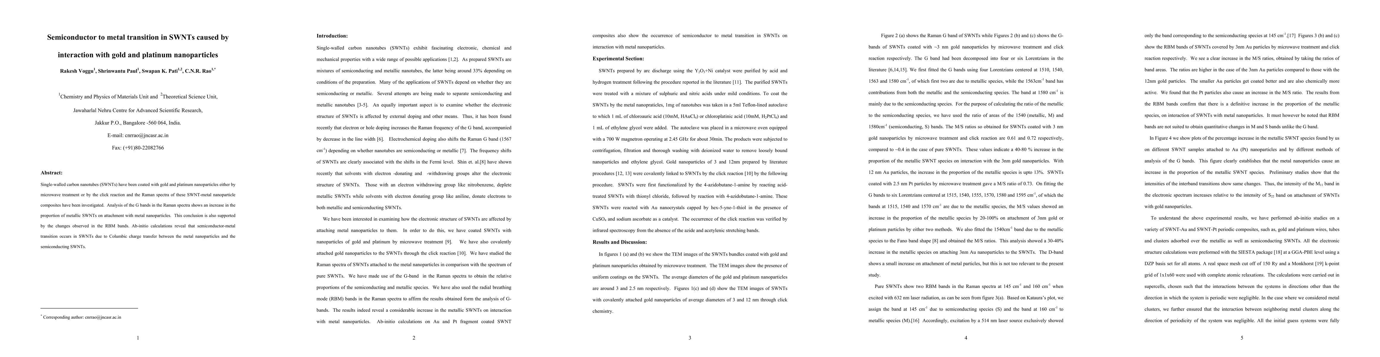 This study investigates the semiconductor-to-metal transition in single-walled carbon nanotubes (SWNTs) upon coating with gold and platinum nanoparticles, achieved via microwave treatment or click reaction. The transition is evidenced by increased metallic SWNT proportion in Raman spectra and supported by ab-initio calculations showing charge transfer between the metal nanoparticles and SWNTs.