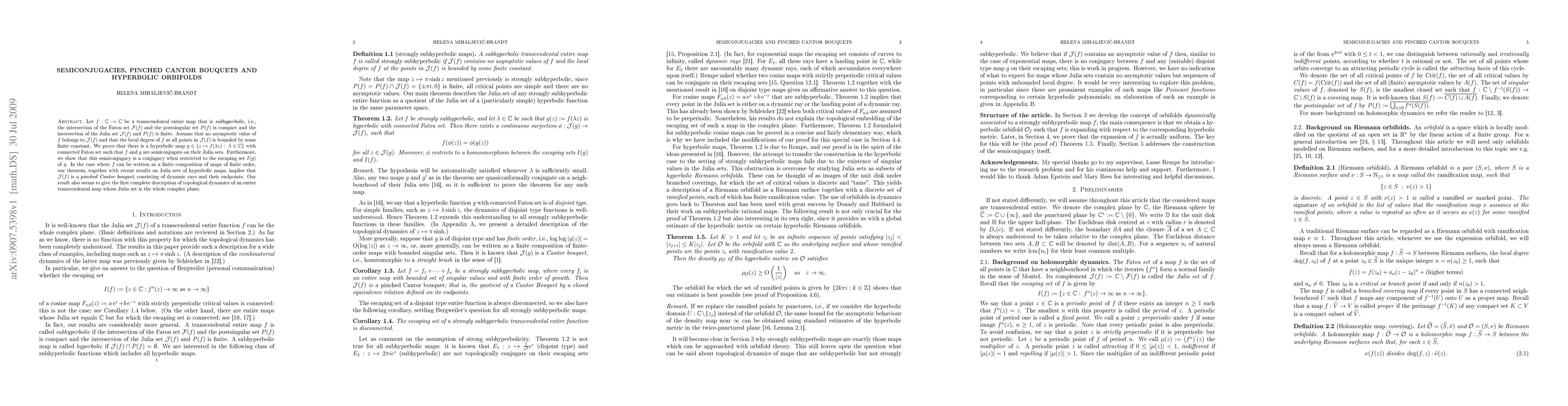 Let f be a transcendental entire map that is subhyperbolic, i.e., the intersection of the Fatou set F(f) and the postsingular set P(f) is compact and the intersection of the Julia set J(f) and P(f) is finite. Assume that no asymptotic value of f belongs to J(f) and that the local degree of f at all points in J(f) is bounded by some finite constant. We prove that there is a hyperbolic map g (of the form g(z)=f(bz) for some complex number b) with connected Fatou set such that f and g are semiconjugate on their Julia sets. Furthermore, we show that this semiconjugacy is a conjugacy when restricted to the escaping set I(g) of g. In the case where f can be written as a finite composition of maps of finite order, our theorem, together with recent results on Julia sets of hyperbolic maps, implies that J(f) is a pinched Cantor bouquet, consisting of dynamic rays and their endpoints. Our result also seems to give the first complete description of topological dynamics of an entire transcendental map whose Julia set is the whole complex plane.