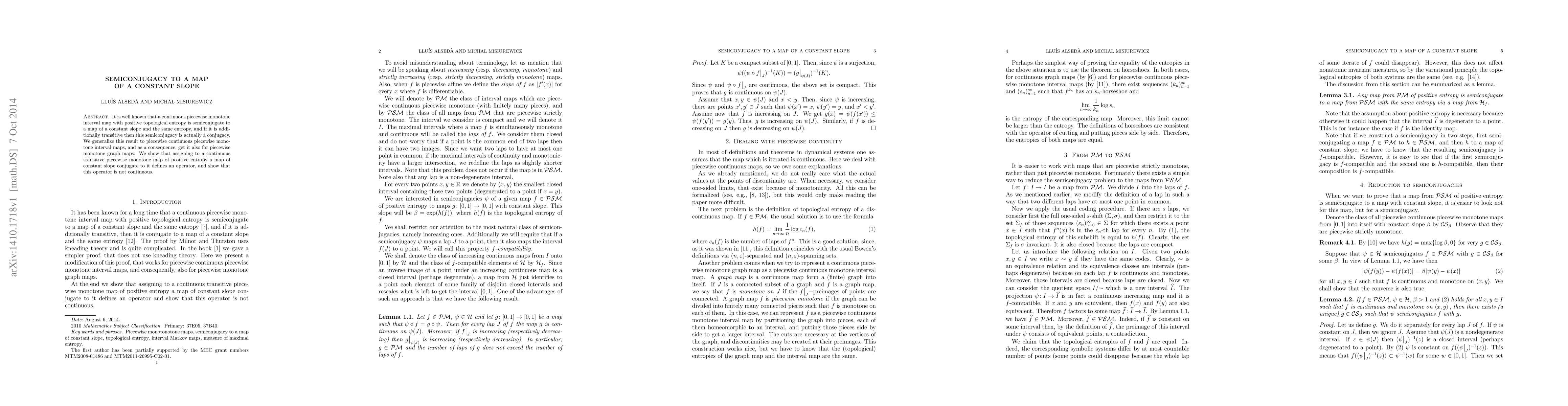 A continuous piecewise monotone interval map with positive entropy is semiconjugate to a map of constant slope, but an operator assigning such conjugacy defines a non-continuous transformation.