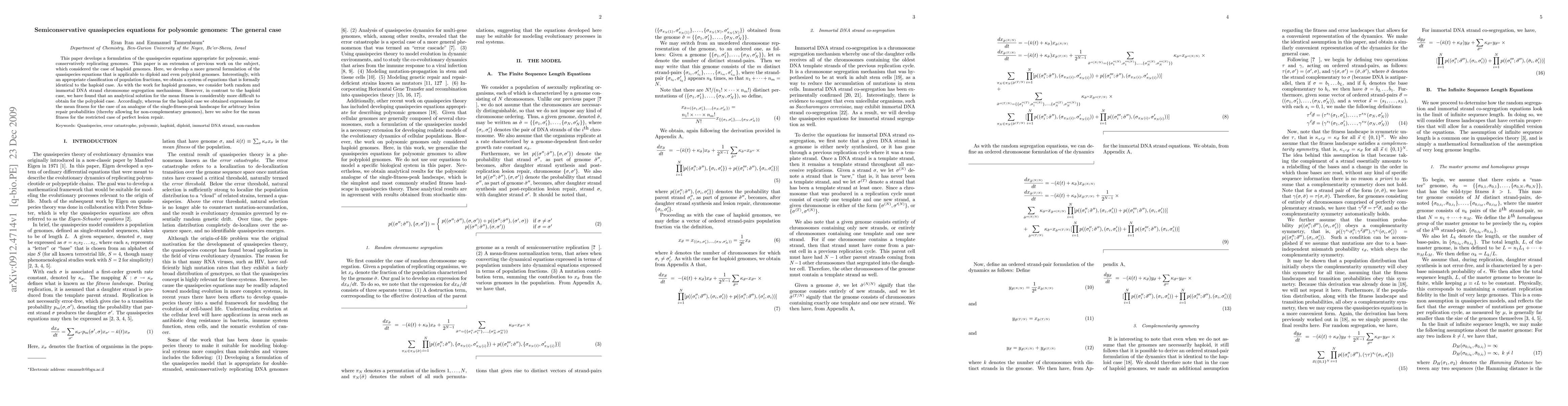 This paper develops a formulation of the quasispecies equations appropriate for polysomic, semiconservatively replicating genomes. This paper is an extension of previous work on the subject, which considered the case of haploid genomes. Here, we develop a more general formulation of the quasispecies equations that is applicable to diploid and even polyploid genomes. Interestingly, with an appropriate classification of population fractions, we obtain a system of equations that is formally identical to the haploid case. As with the work for haploid genomes, we consider both random and immortal DNA strand chromosome segregation mechanisms. However, in contrast to the haploid case, we have found that an analytical solution for the mean fitness is considerably more difficult to obtain for the polyploid case. Accordingly, whereas for the haploid case we obtained expressions for the mean fitness for the case of an analogue of the single-fitness-peak landscape for arbitrary lesion repair probabilities (thereby allowing for non-complementary genomes), here we solve for the mean fitness for the restricted case of perfect lesion repair.