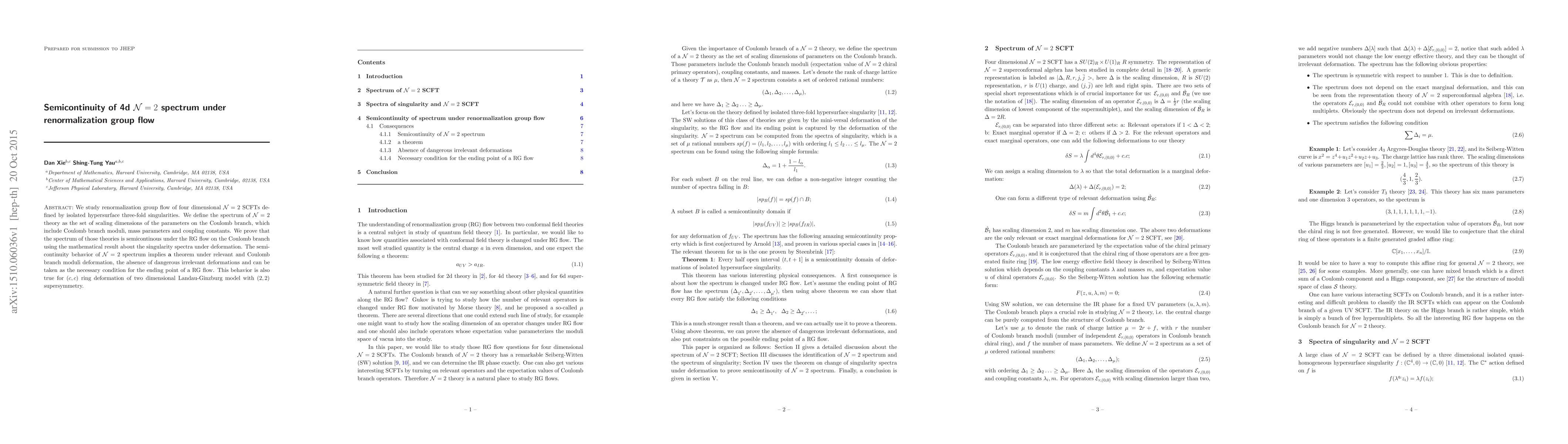 We study renormalization group flow of four dimensional N=2 SCFTs defined by isolated hypersurface three-fold singularities. We define the spectrum of N=2 theory as the set of scaling dimensions of the parameters on the Coulomb branch, which include Coulomb branch moduli, mass parameters and coupling constants. We prove that the spectrum of those theories is semicontinous under the RG flow on the Coulomb branch using the mathematical result about the singularity spectra under deformation. The semicontinuity behavior of N=2 spectrum implies a theorem under relevant and Coulomb branch moduli deformation, the absence of dangerous irrelevant deformations and can be taken as the necessary condition for the ending point of a RG flow. This behavior is also true for (c,c) ring deformation of two dimensional Landau-Ginzburg model with (2,2) supersymmetry.