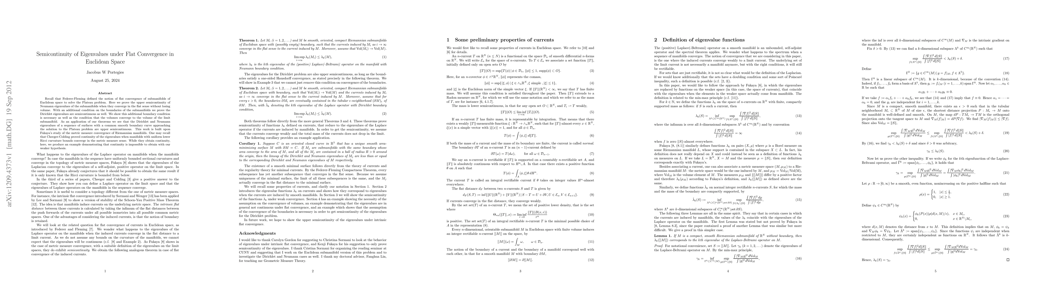 This paper proves the upper semicontinuity of Neumann eigenvalues and, under additional boundary conditions, the semicontinuity of Dirichlet eigenvalues for submanifolds converging in the flat sense without volume loss. It demonstrates that the eigenvalues of surfaces approaching the solution to the Plateau problem are upper semicontinuous.