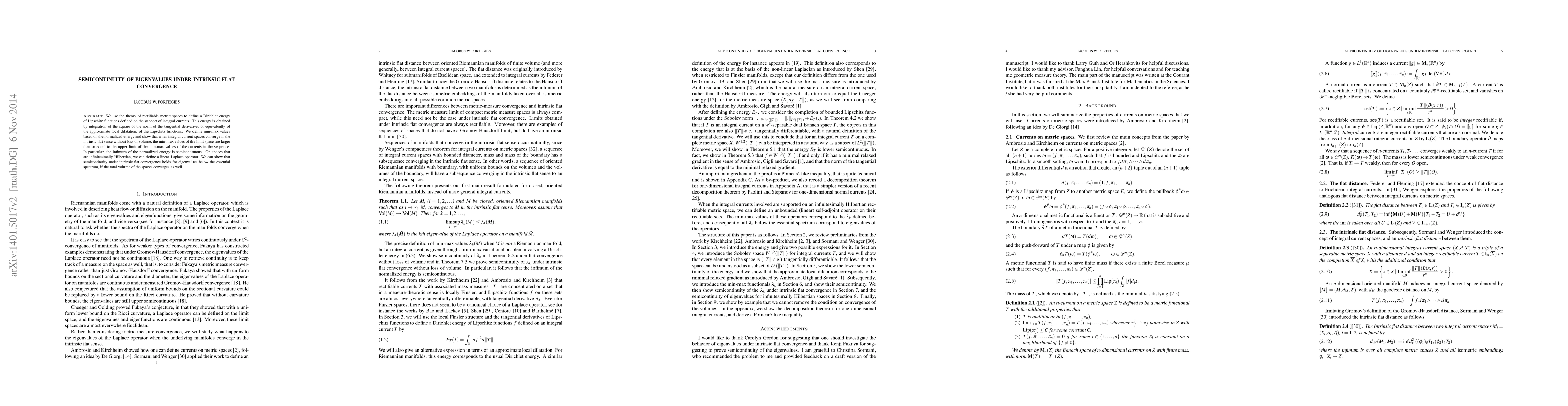 This paper establishes semicontinuity of eigenvalues under intrinsic flat convergence using the theory of rectifiable metric spaces and integral currents. It shows that min-max values of the limit space are greater than or equal to the upper limit of the sequence, with particular focus on eigenvalues below the essential spectrum when total volume converges.