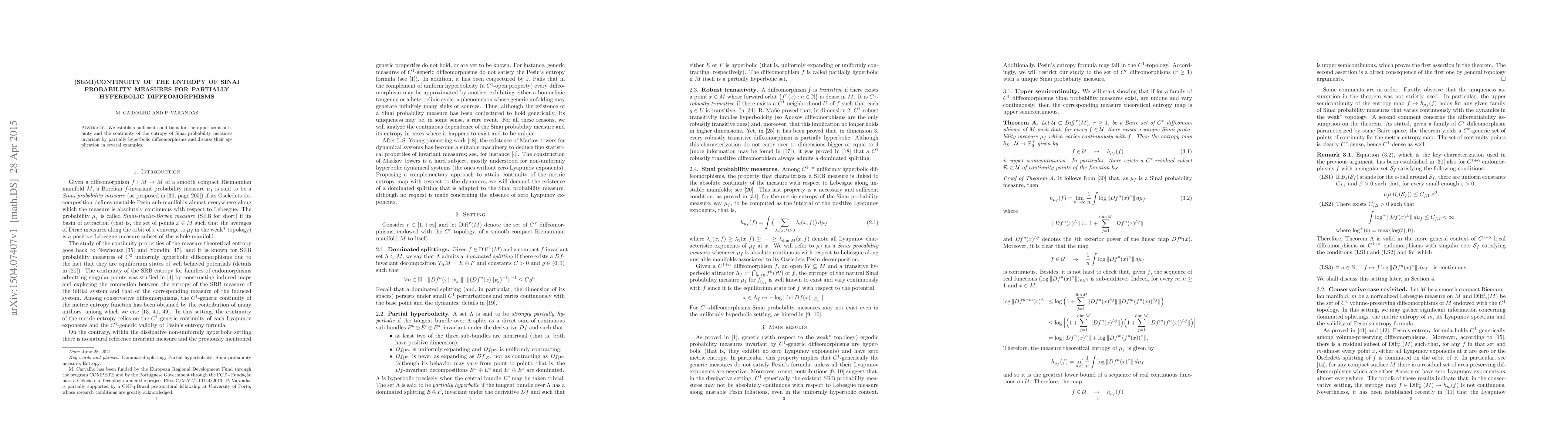 Summary: This paper provides conditions for the upper semicontinuity and continuity of the entropy of Sinai probability measures for partially hyperbolic diffeomorphisms, and applies these findings to various examples.