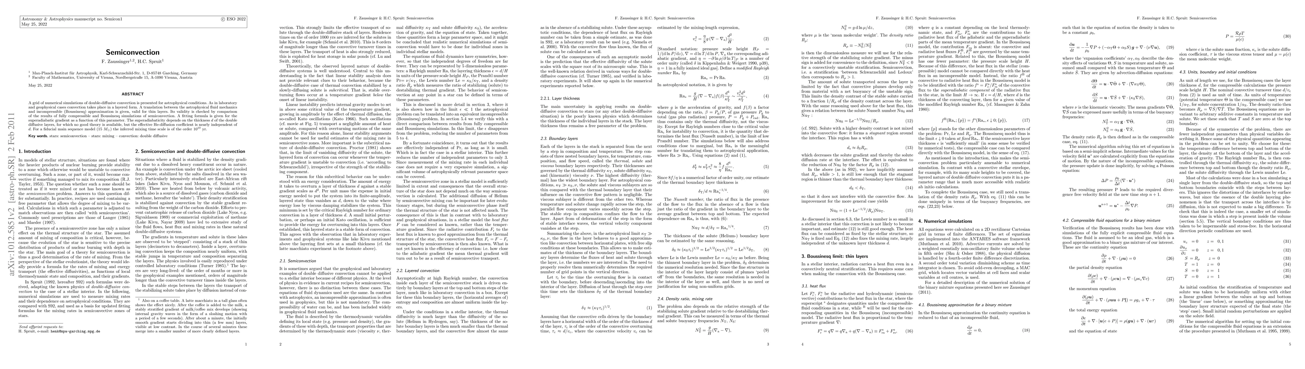 A grid of numerical simulations of double-diffusive convection is presented for astrophysical conditions. As in laboratory and geophysical cases convection takes place in a layered form. A translation between the astrophysical fluid mechanics and incompressible (Boussinesq) approximation is given, valid for thin layers. Its validity is checked by comparison of the results of fully compressible and Boussinesq simulations of semiconvection. A fitting formula is given for the superadiabatic gradient as a function of this parameter. The superadiabaticity depends on the thickness $d$ of the double diffusive layers, for which no good theory is available, but the effective He-diffusion coefficient is nearly independent of $d$. For a fiducial main sequence model (15 $M_\odot$) the inferred mixing time scale is of the order $10^{10}$ yr.