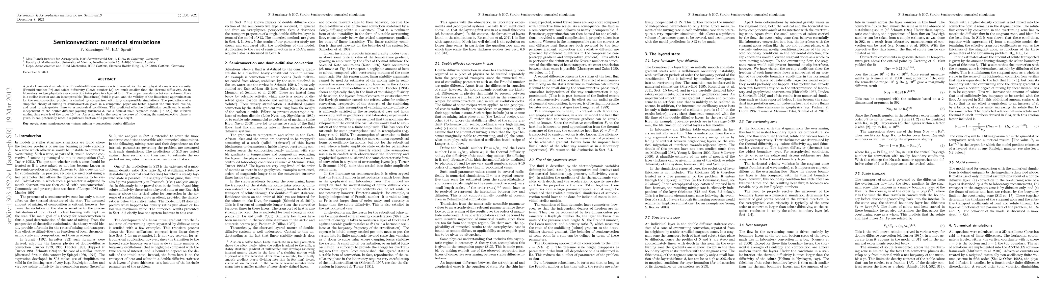 This paper presents numerical simulations of double-diffusive convection in astrophysical contexts, focusing on semiconvection where viscosity and solute diffusivity are much smaller than thermal diffusivity. The study validates the Boussinesq approximation and predicts an effective He-diffusion coefficient nearly independent of layering thickness, with a mixing timescale of around $10^{10}$ years for a 15 $M_\odot$ main sequence model.
