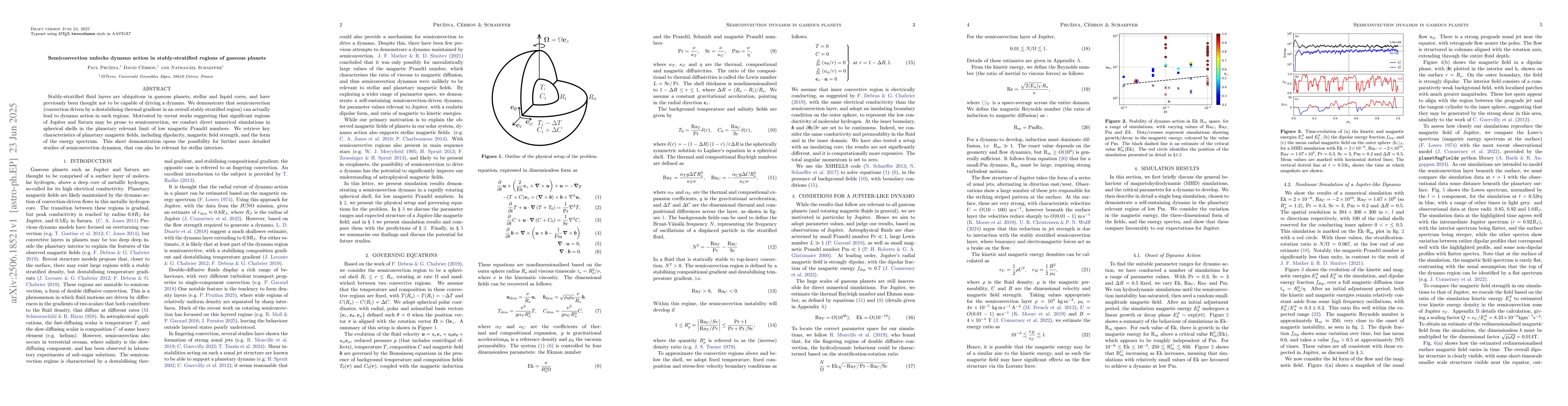 Stably-stratified fluid layers are ubiquitous in gaseous planets, stellar and liquid cores, and have previously been thought not to be capable of driving a dynamo. We demonstrate that semiconvection (convection driven by a destabilising thermal gradient in an overall stably stratified region) can actually lead to dynamo action in such regions. Motivated by recent works suggesting that significant regions of Jupiter and Saturn may be prone to semiconvection, we conduct direct numerical simulations in spherical shells in the planetary relevant limit of low magnetic Prandtl numbers. We retrieve key characteristics of planetary magnetic fields, including dipolarity, magnetic field strength, and the form of the energy spectrum. This short demonstration opens the possibility for further more detailed studies of semiconvection dynamos, that can also be relevant for stellar interiors.
