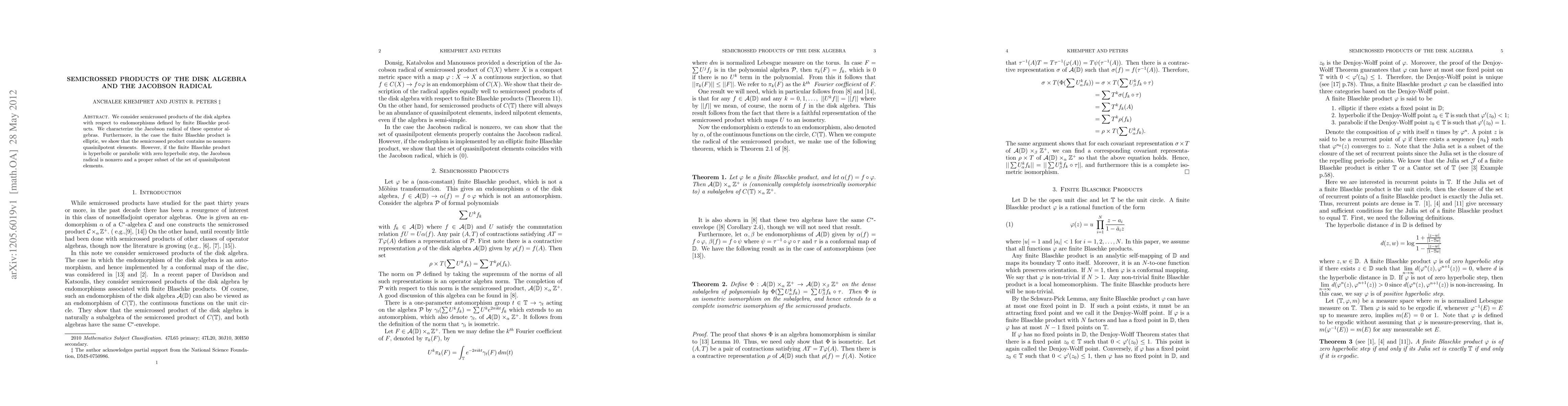 We consider semicrossed products of the disk algebra with respect to endomorphisms defined by finite Blaschke products. We characterize the Jacobson radical of these operator algebras. Furthermore, in the case the finite Blaschke product is elliptic, we show that the semicrossed product contains no nonzero quasinilpotent elements. However, if the finite Blaschke product is hyperbolic or parabolic with zero hyperbolic step, the Jacobson radical is nonzero and a proper subset of the set of quasinilpotent elements.
