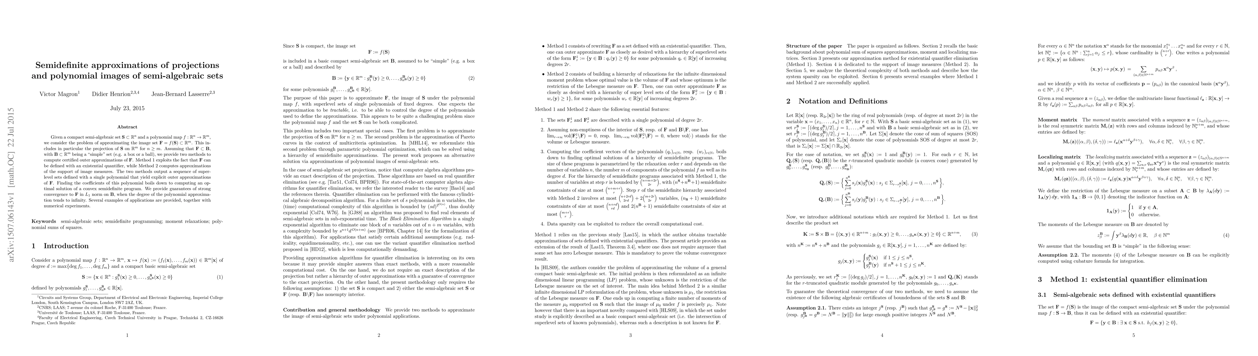 Given a compact semialgebraic set S of R^n and a polynomial map f from R^n to R^m, we consider the problem of approximating the image set F = f(S) in R^m. This includes in particular the projection of S on R^m for n greater than m. Assuming that F is included in a set B which is "simple" (e.g. a box or a ball), we provide two methods to compute certified outer approximations of F. Method 1 exploits the fact that F can be defined with an existential quantifier, while Method 2 computes approximations of the support of image measures.The two methods output a sequence of superlevel sets defined with a single polynomial that yield explicit outer approximations of F. Finding the coefficients of this polynomial boils down to computing an optimal solution of a convex semidefinite program. We provide guarantees of strong convergence to F in L^1 norm on B, when the degree of the polynomial approximation tends to infinity. Several examples of applications are provided, together with numerical experiments.