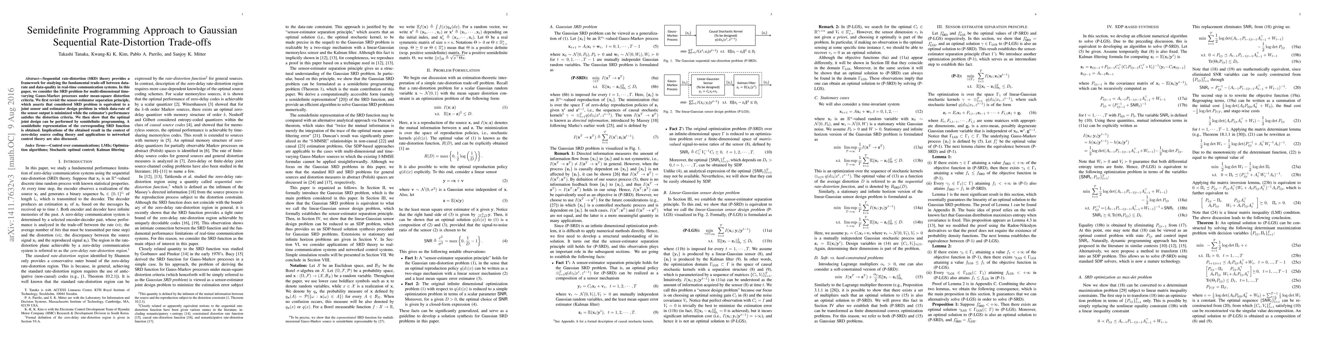 This paper explores the application of semidefinite programming to solve the sequential rate-distortion problem for multi-dimensional time-varying Gauss-Markov processes, demonstrating that the optimal sensor and estimator design can be achieved through this method. The findings have implications for zero-delay source coding and networked control theory.