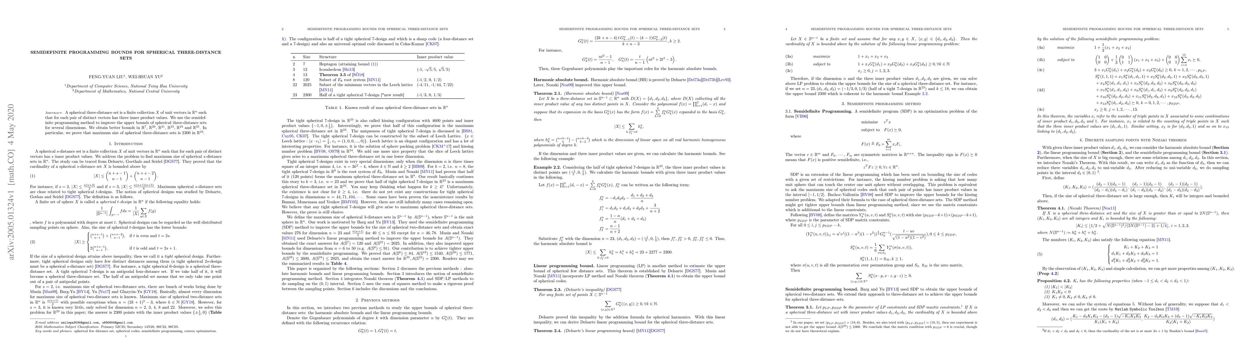 The paper improves upper bounds for spherical three-distance sets in various dimensions using semidefinite programming, achieving better results in $\mathbb{R}^7$, $\mathbb{R}^{20}$, $\mathbb{R}^{21}$, $\mathbb{R}^{23}$, $\mathbb{R}^{24}$, and $\mathbb{R}^{25}$, notably proving a maximum size of 2300 in $\mathbb{R}^{23}$.