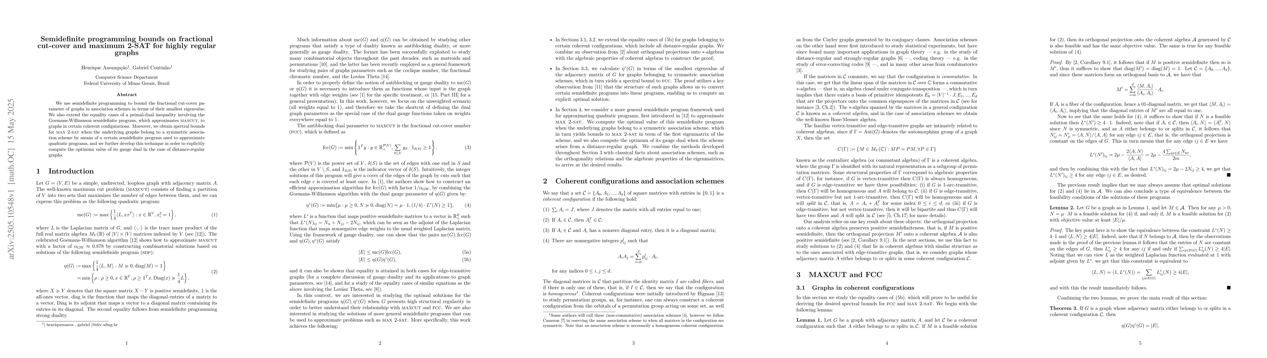 The research employs semidefinite programming to bound the fractional cut-cover parameter of graphs in association schemes using their smallest eigenvalue. It also extends the Goemans-Williamson SDP approximation for MaxCut to specific coherent configurations and derives spectral bounds for Max 2-SAT on symmetric association scheme graphs.