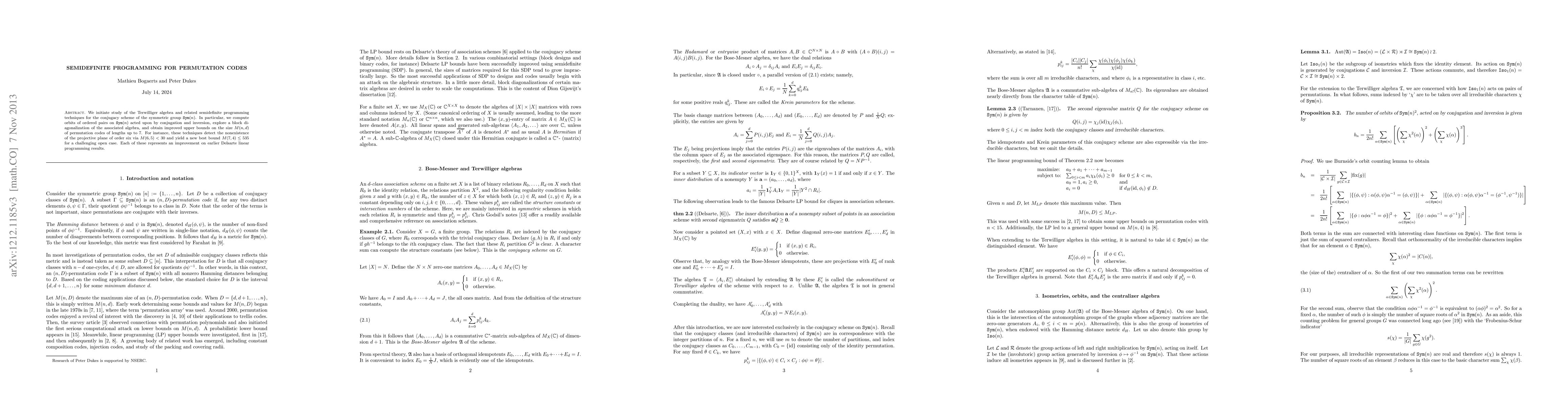 This paper employs semidefinite programming and the Terwilliger algebra to study permutation codes, achieving improved upper bounds on their sizes for lengths up to 7. It detects the nonexistence of the projective plane of order six and provides a new best bound for a specific open case.
