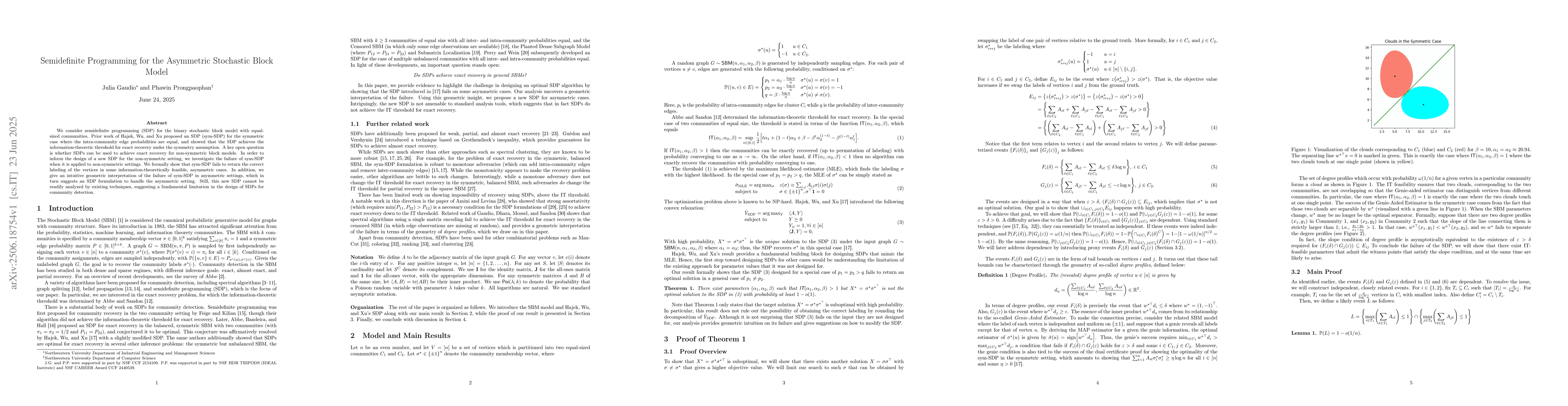 We consider semidefinite programming (SDP) for the binary stochastic block model with equal-sized communities. Prior work of Hajek, Wu, and Xu proposed an SDP (sym-SDP) for the symmetric case where the intra-community edge probabilities are equal, and showed that the SDP achieves the information-theoretic threshold for exact recovery under the symmetry assumption. A key open question is whether SDPs can be used to achieve exact recovery for non-symmetric block models. In order to inform the design of a new SDP for the non-symmetric setting, we investigate the failure of sym-SDP when it is applied to non-symmetric settings. We formally show that sym-SDP fails to return the correct labeling of the vertices in some information-theoretically feasible, asymmetric cases. In addition, we give an intuitive geometric interpretation of the failure of sym-SDP in asymmetric settings, which in turn suggests an SDP formulation to handle the asymmetric setting. Still, this new SDP cannot be readily analyzed by existing techniques, suggesting a fundamental limitation in the design of SDPs for community detection.