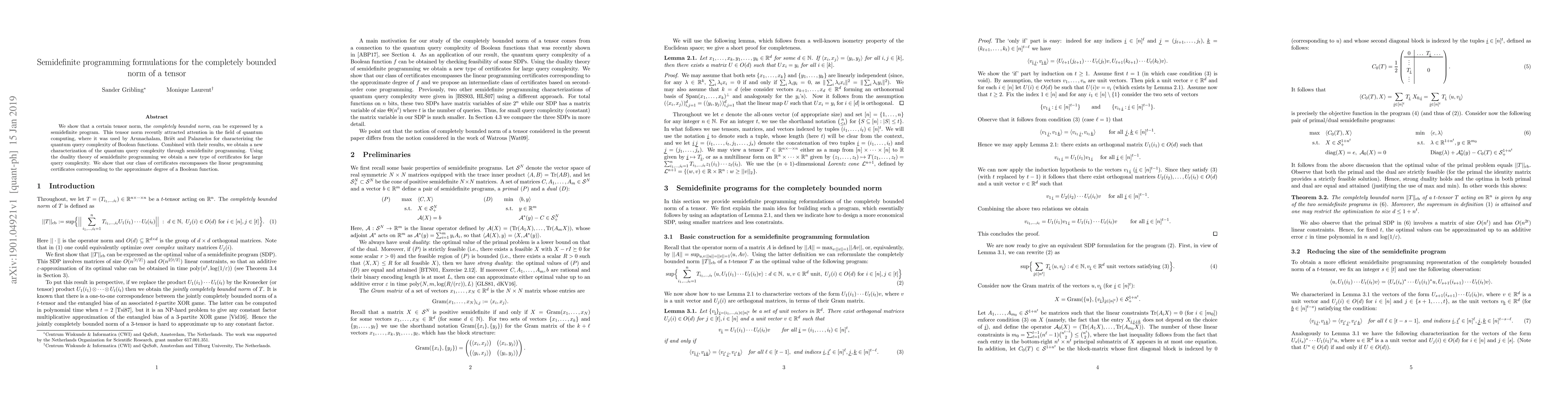 This paper presents a semidefinite programming formulation for the completely bounded norm of a tensor, which is significant in quantum computing for characterizing quantum query complexity. It also introduces new certificates for large query complexity through semidefinite programming duality, extending beyond linear programming certificates for approximate degree.