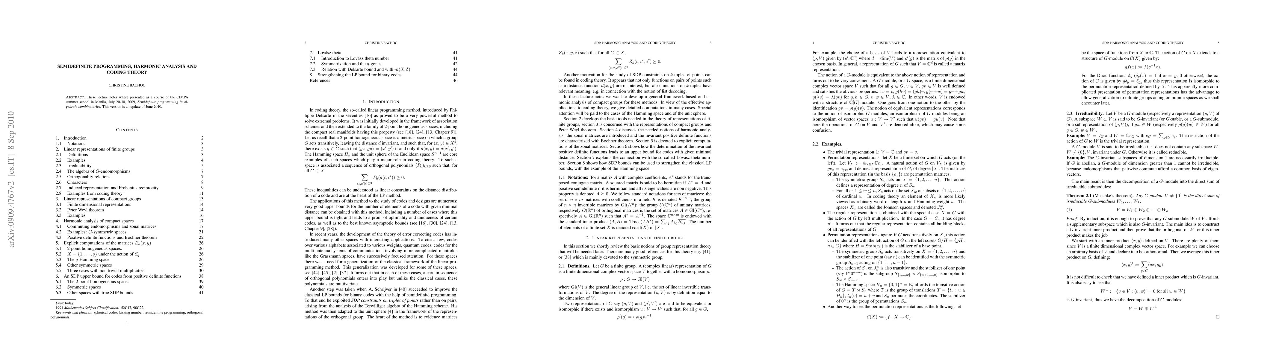 This paper explores the intersection of semidefinite programming, harmonic analysis, and coding theory, focusing on their applications in algebraic combinatorics. The updated lecture notes from a CIMPA summer school course provide a comprehensive overview of these topics, emphasizing their relevance and recent developments.