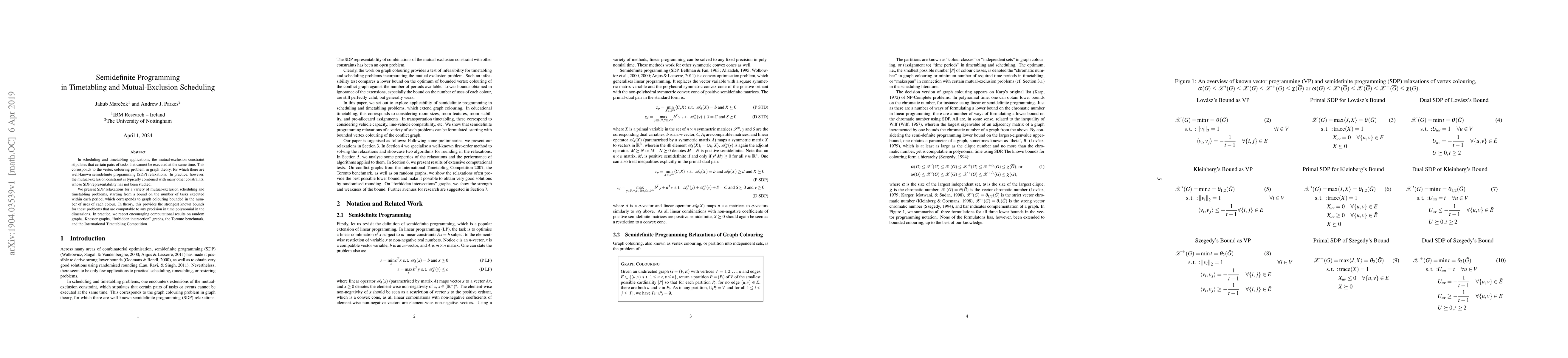 Researchers developed semidefinite programming (SDP) relaxations for timetabling problems with mutual-exclusion constraints, providing strong theoretical bounds and encouraging computational results on various graphs and benchmarks.