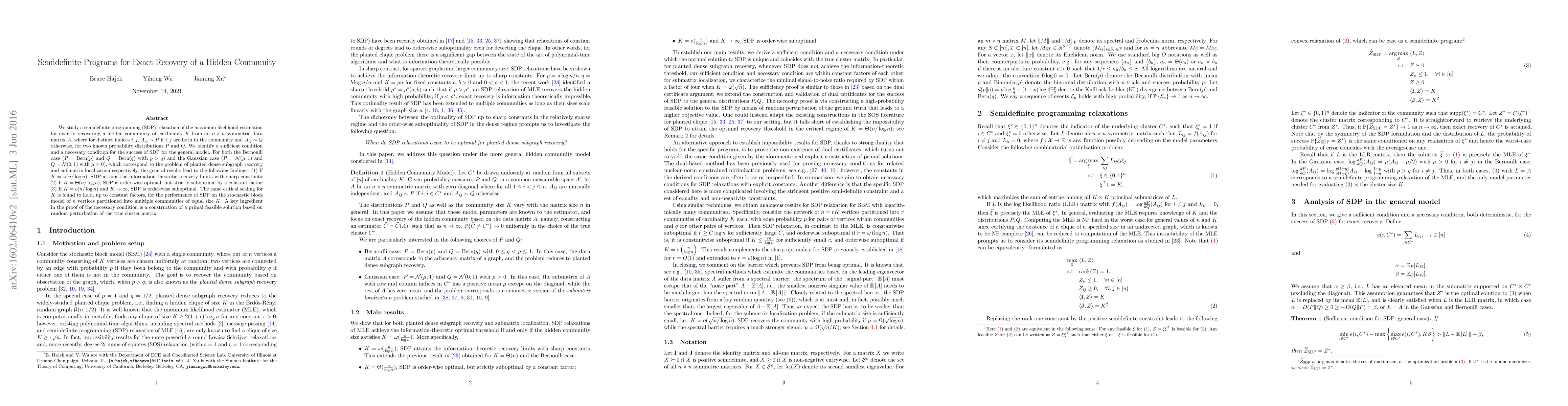 This research identifies conditions for the success of Semidefinite Programming (SDP) in exactly recovering a hidden community from a symmetric data matrix, with findings showing SDP's optimality for various probability distributions and community sizes. It also extends these results to the stochastic block model.