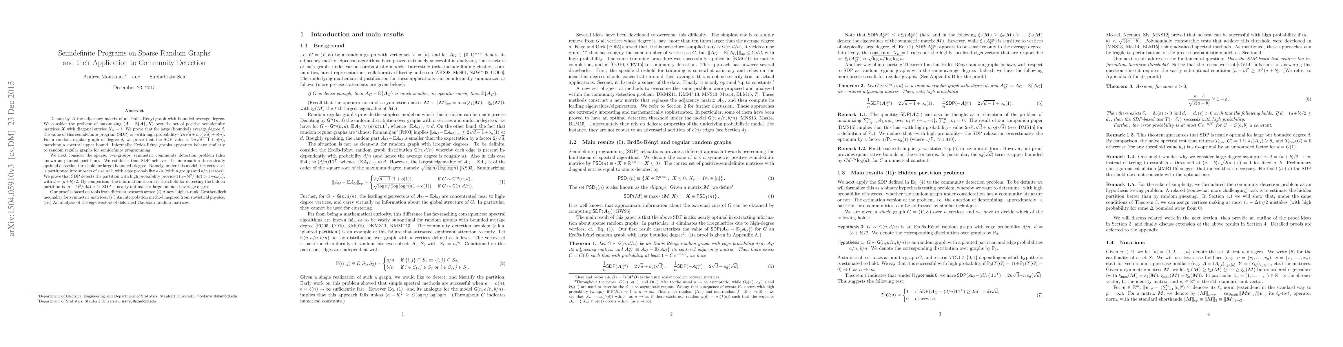 A research paper explores community detection on sparse random graphs using semidefinite programs, finding that SDP can nearly achieve the information-theoretic optimal detection threshold for large bounded average degree.