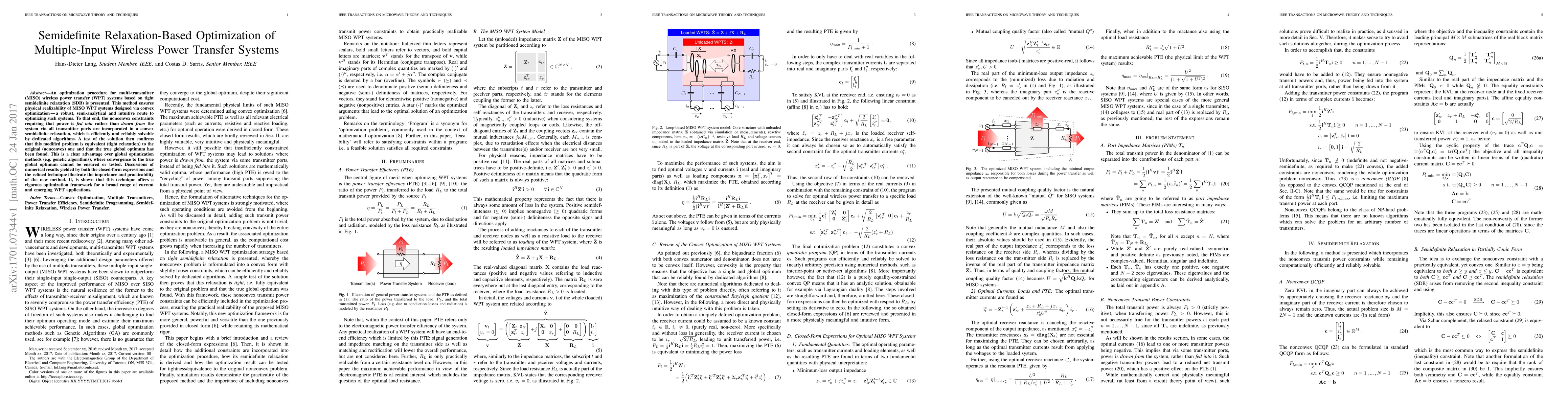 This paper presents an optimization method for multi-transmitter wireless power transfer systems using semidefinite relaxation, ensuring physical realizability and global optimality. The method efficiently solves nonconvex constraints and provides a rigorous framework for optimizing current and future wireless power transfer applications.