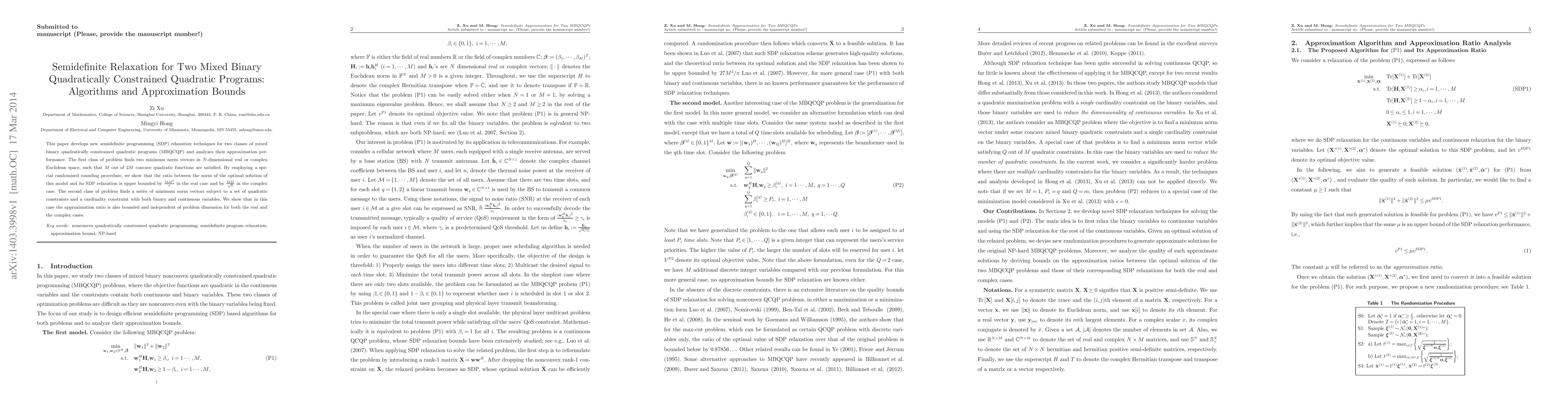 This paper develops new semidefinite programming (SDP) relaxation techniques for two classes of mixed binary quadratically constrained quadratic programs (MBQCQP) and analyzes their approximation performance. The first class of problem finds two minimum norm vectors in $N$-dimensional real or complex Euclidean space, such that $M$ out of $2M$ concave quadratic functions are satisfied. By employing a special randomized rounding procedure, we show that the ratio between the norm of the optimal solution of this model and its SDP relaxation is upper bounded by $\frac{54M^2}{\pi}$ in the real case and by $\frac{24M}{\sqrt{\pi}}$ in the complex case. The second class of problem finds a series of minimum norm vectors subject to a set of quadratic constraints and a cardinality constraint with both binary and continuous variables. We show that in this case the approximation ratio is also bounded and independent of problem dimension for both the real and the complex cases.