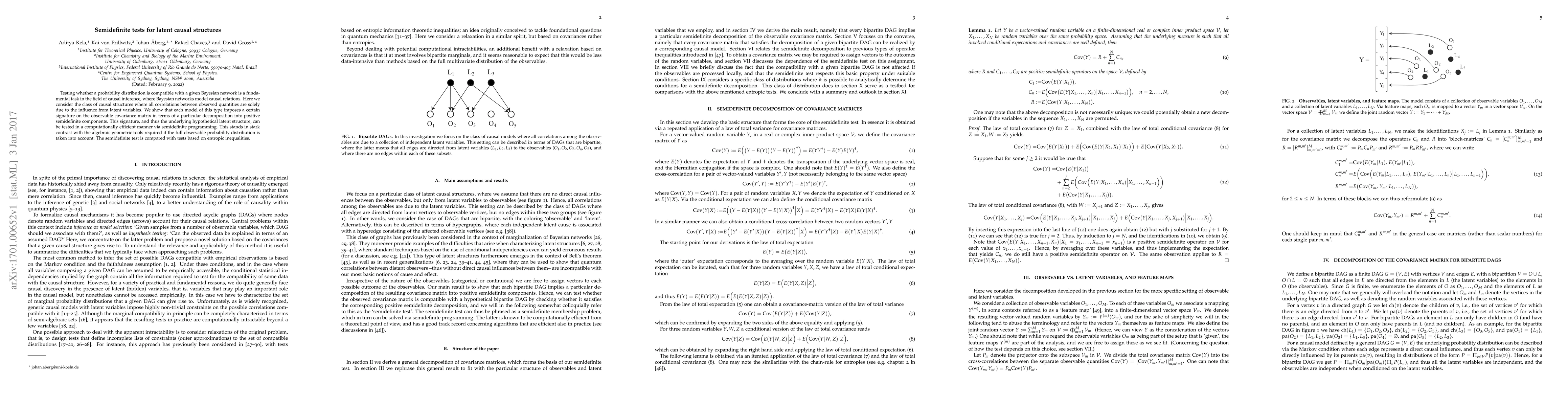 Testing whether a probability distribution is compatible with a given Bayesian network is a fundamental task in the field of causal inference, where Bayesian networks model causal relations. Here we consider the class of causal structures where all correlations between observed quantities are solely due to the influence from latent variables. We show that each model of this type imposes a certain signature on the observable covariance matrix in terms of a particular decomposition into positive semidefinite components. This signature, and thus the underlying hypothetical latent structure, can be tested in a computationally efficient manner via semidefinite programming. This stands in stark contrast with the algebraic geometric tools required if the full observable probability distribution is taken into account. The semidefinite test is compared with tests based on entropic inequalities.