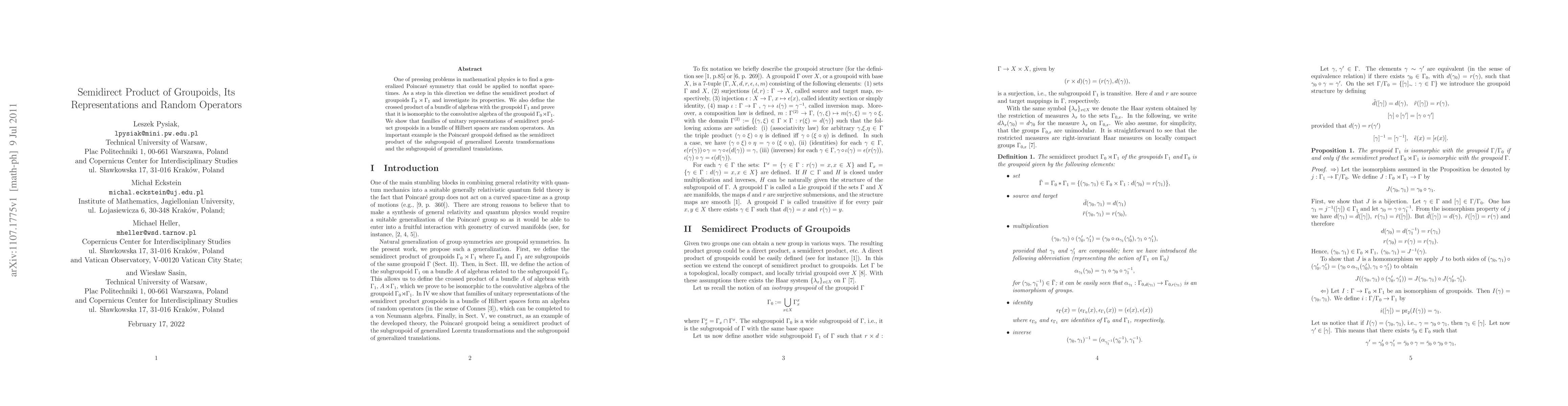 This paper defines the semidirect product of groupoids and explores its representations, showing that these representations correspond to random operators. It also investigates the Poincaré groupoid as a significant example of such a structure in nonflat space-times.