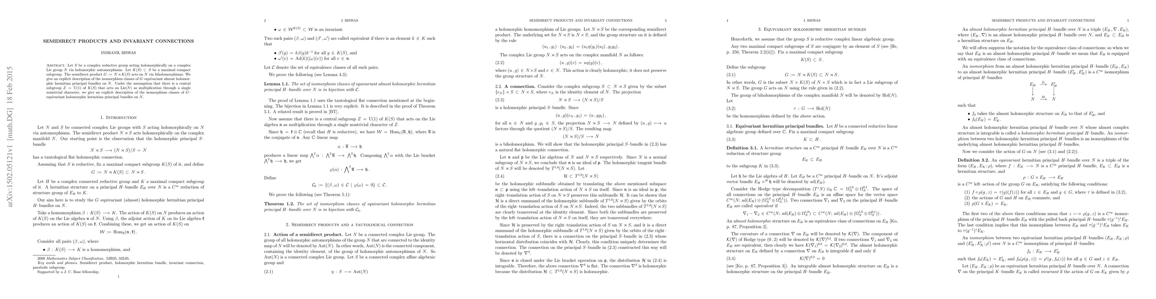 This paper describes the isomorphism classes of equivariant almost holomorphic hermitian principal bundles on a complex Lie group N under the action of a semidirect product G, which is N times a maximal compact subgroup K(S) of a complex reductive group S. Under specific conditions involving a central U(1) subgroup of K(S), the paper also provides an explicit description for equivariant holomorphic hermitian principal bundles on N.