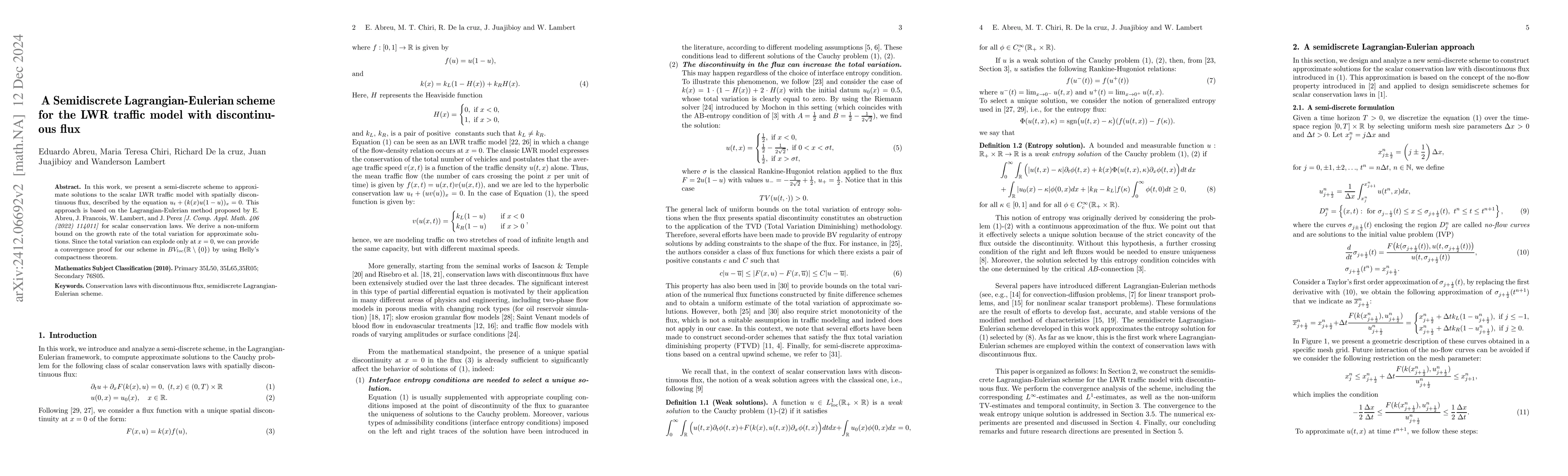 This paper introduces a semi-discrete Lagrangian-Eulerian scheme for the LWR traffic model, addressing scenarios with discontinuous flux. It provides a convergence proof and a non-uniform bound on the total variation growth for approximate solutions, leveraging Kolmogorov-Riesz's $L^1$-compactness theorem.