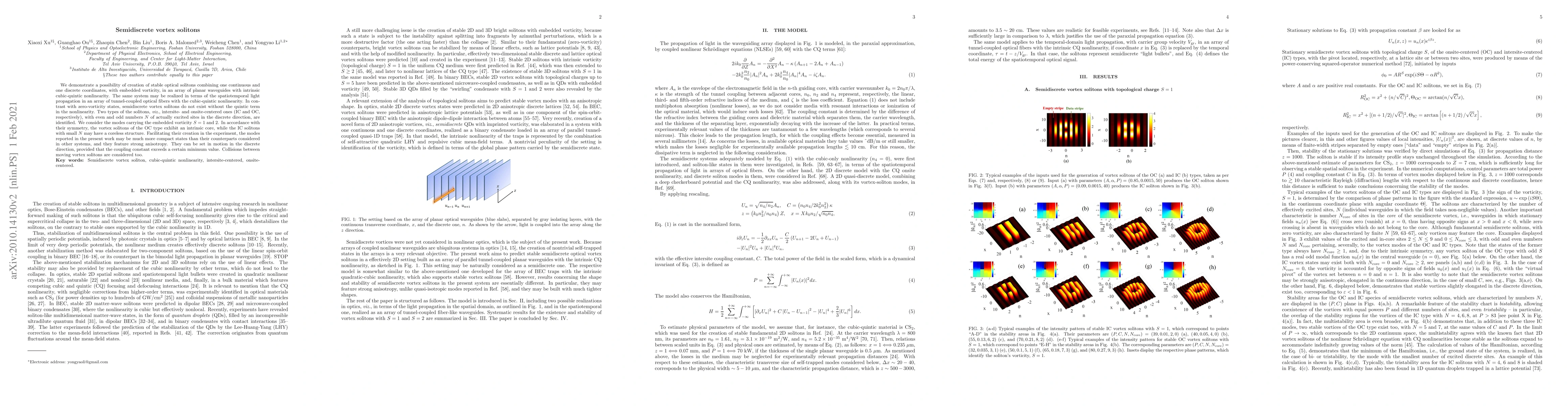 This paper explores the creation of stable optical solitons in an array of planar waveguides with cubic-quintic nonlinearity, featuring embedded vorticity. It identifies two types of semidiscrete vortex solitons, intersite- and onsite-centered, and discusses their compact and anisotropic nature, as well as their motion and collision dynamics.