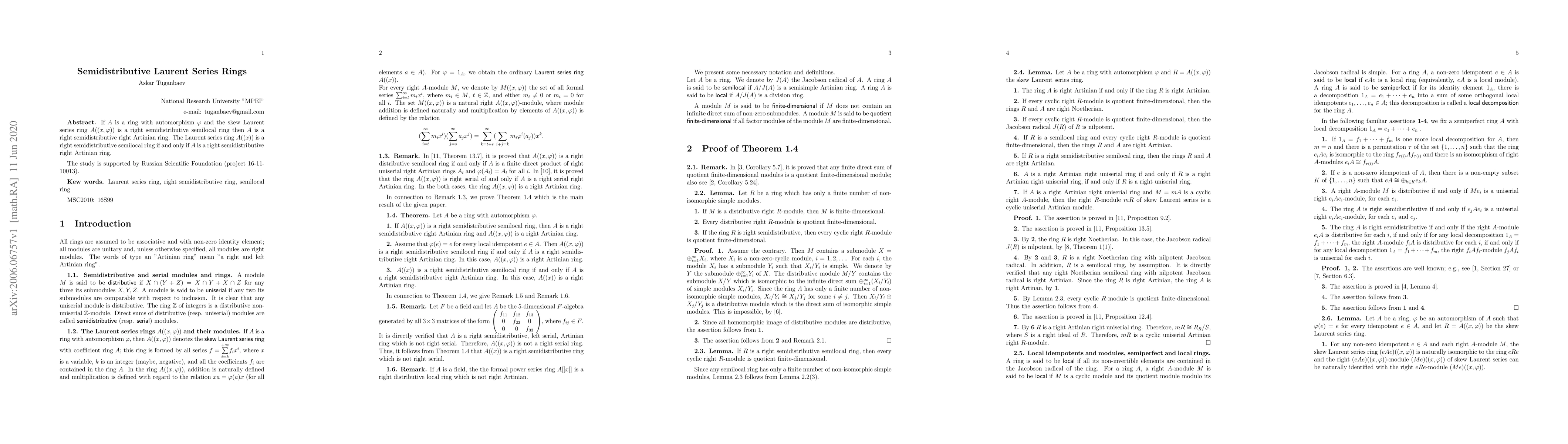 If $A$ is a ring with automorphism $\varphi$ and the skew Laurent series ring $A((x,\varphi ))$ is a right semidistributive semilocal ring then $A$ is a right semidistributive right Artinian ring. The Laurent series ring $A((x))$ is a right semidistributive semilocal ring if and only if $A$ is a right semidistributive right Artinian ring. The study is supported by Russian Scientific Foundation (project 16-11-10013).