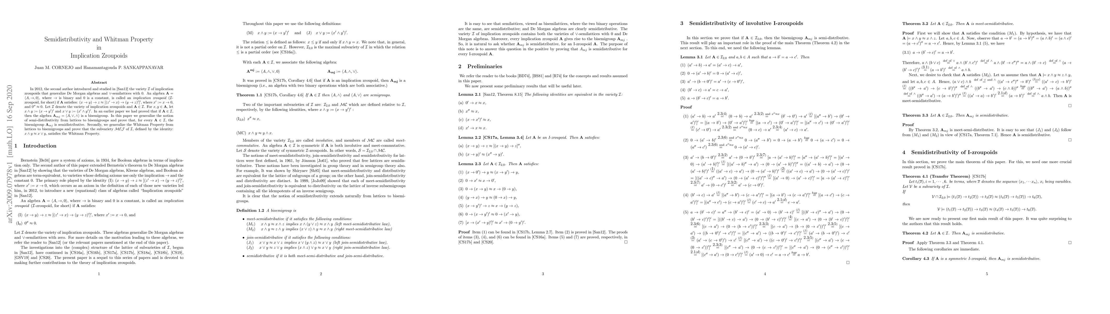 This paper investigates implication zroupoids, a generalization of De Morgan algebras and $\lor$-semilattices with $0$, and proves that the associated bisemigroup is semidistributive. It also extends the Whitman Property to bisemigroups and shows that a specific subvariety of implication zroupoids satisfies this property.