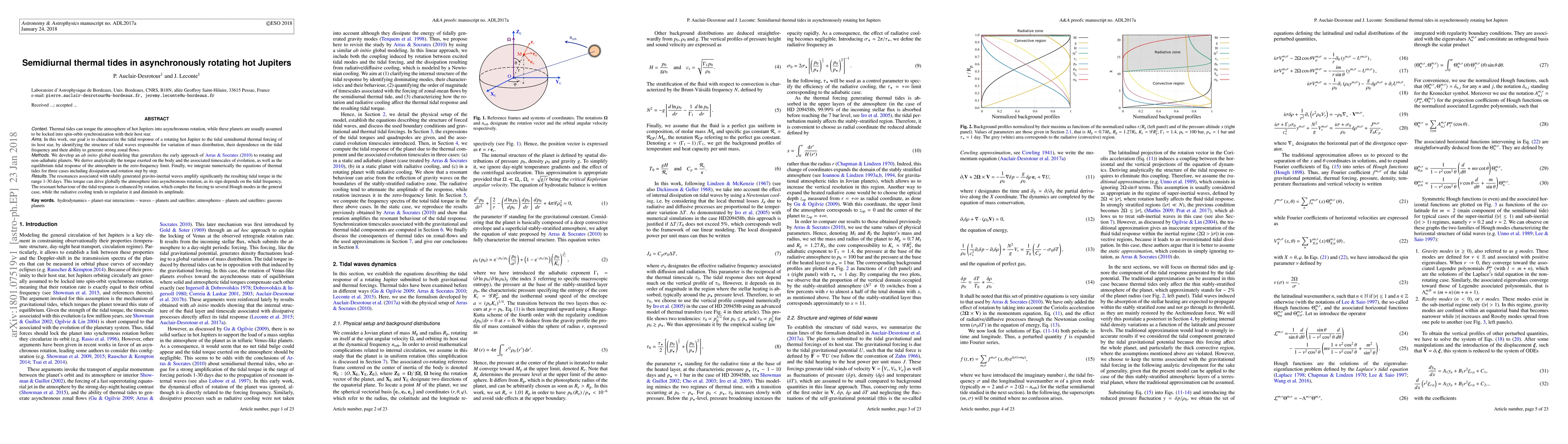 This paper investigates the tidal response of rotating hot Jupiters to semidiurnal thermal forcing from their host stars, showing how tidal torques can lead to asynchronous rotation, and explores the structure and dynamics of tidal waves, their dependence on frequency, and the generation of zonal flows. The study reveals resonant amplification of tidal torques, which can drive atmospheric asynchronous rotation, with rotation enhancing resonant behavior and radiative cooling diminishing its effects.