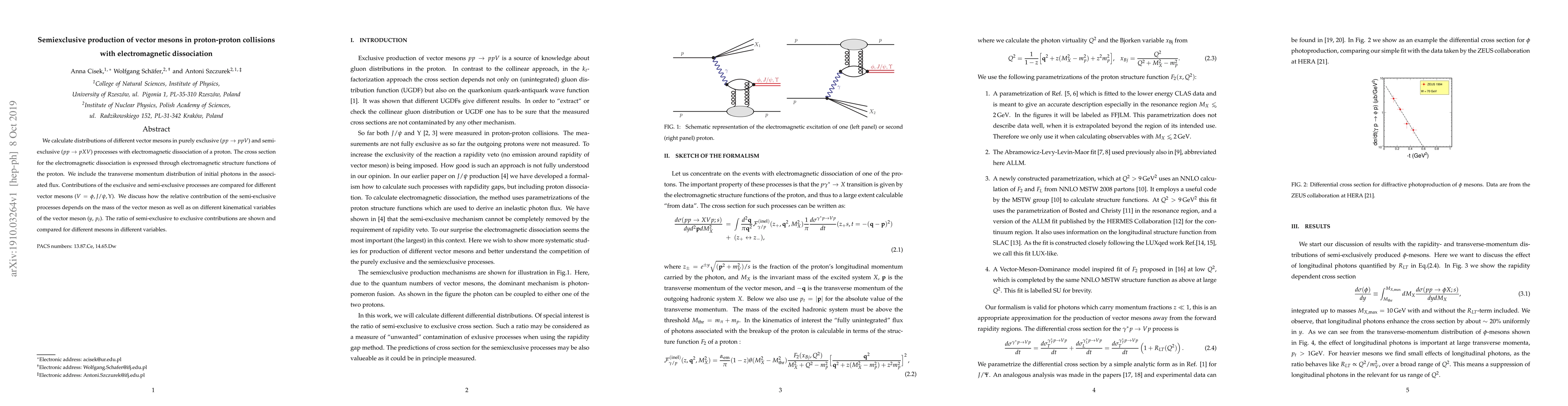 We calculate distributions of different vector mesons in purely exclusive ($p p \to p p V$) and semi-exclusive ($p p \to p X V$) processes with electromagnetic dissociation of a proton. The cross section for the electromagnetic dissociation is expressed through electromagnetic structure functions of the proton. We include the transverse momentum distribution of initial photons in the associated flux. Contributions of the exclusive and semi-exclusive processes are compared for different vector mesons ($V = \phi, J/\psi, \Upsilon$). We discuss how the relative contribution of the semi-exclusive processes depends on the mass of the vector meson as well as on different kinematical variables of the vector meson ($y$, $p_t$). The ratio of semi-exclusive to exclusive contributions are shown and compared for different mesons in different variables.