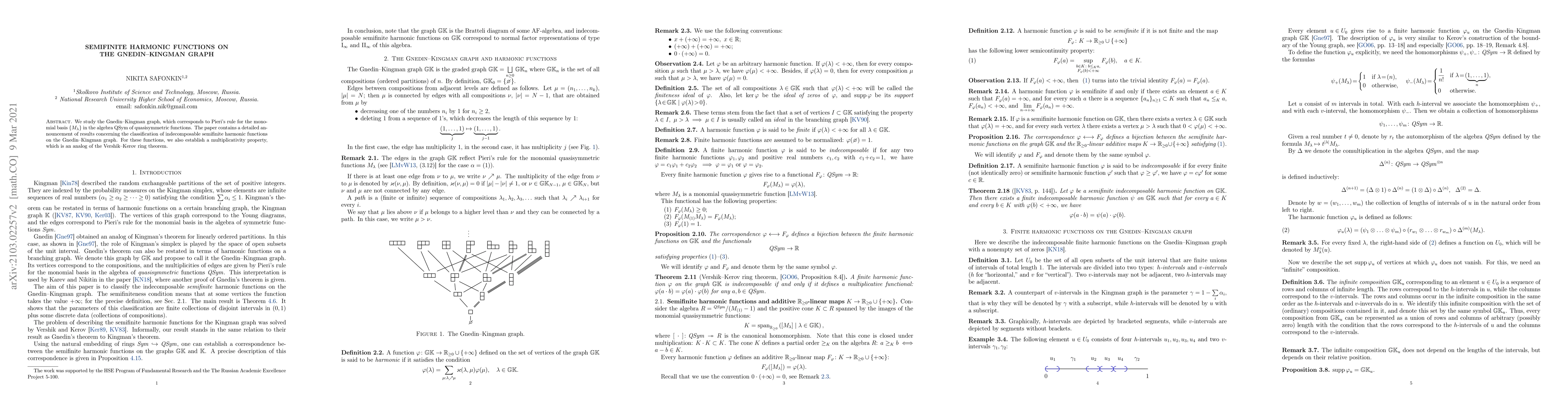 The paper studies the Gnedin-Kingman graph, corresponding to Pieri's rule for the monomial basis in the algebra of quasisymmetric functions (QSym), focusing on the classification of indecomposable semi-finite harmonic functions and establishing a multiplicativity property analogous to the Vershik-Kerov ring theorem.