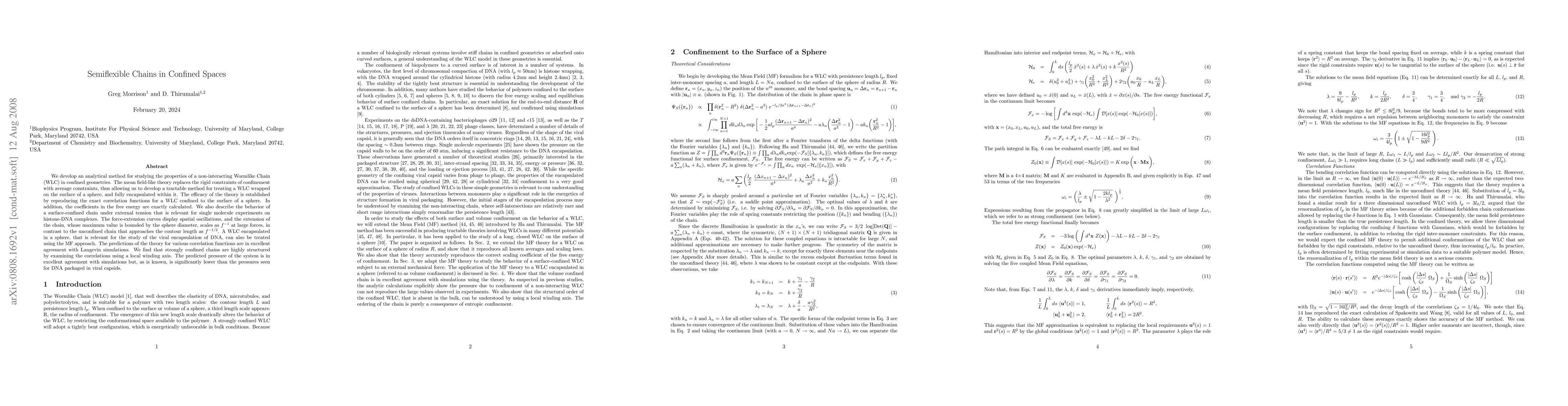 We develop an analytical method for studying the properties of a non-interacting Wormlike Chain (WLC) in confined geometries. The mean field-like theory replaces the rigid constraints of confinement with average constraints, thus allowing us to develop a tractable method for treating a WLC wrapped on the surface of a sphere, and fully encapsulated within it. The efficacy of the theory is established by reproducing the exact correlation functions for a WLC confined to the surface of a sphere. In addition, the coefficients in the free energy are exactly calculated. We also describe the behavior of a surface-confined chain under external tension that is relevant for single molecule experiments on histone-DNA complexes. The force-extension curves display spatial oscillations, and the extension of the chain, whose maximum value is bounded by the sphere diameter, scales as $f^{-1}$ at large forces, in contrast to the unconfined chain that approaches the contour length as $f^{-1/2}$. A WLC encapsulated in a sphere, that is relevant for the study of the viral encapsulation of DNA, can also be treated using the MF approach. The predictions of the theory for various correlation functions are in excellent agreement with Langevin simulations. We find that strongly confined chains are highly structured by examining the correlations using a local winding axis. The predicted pressure of the system is in excellent agreement with simulations but, as is known, is significantly lower than the pressures seen for DNA packaged in viral capsids.