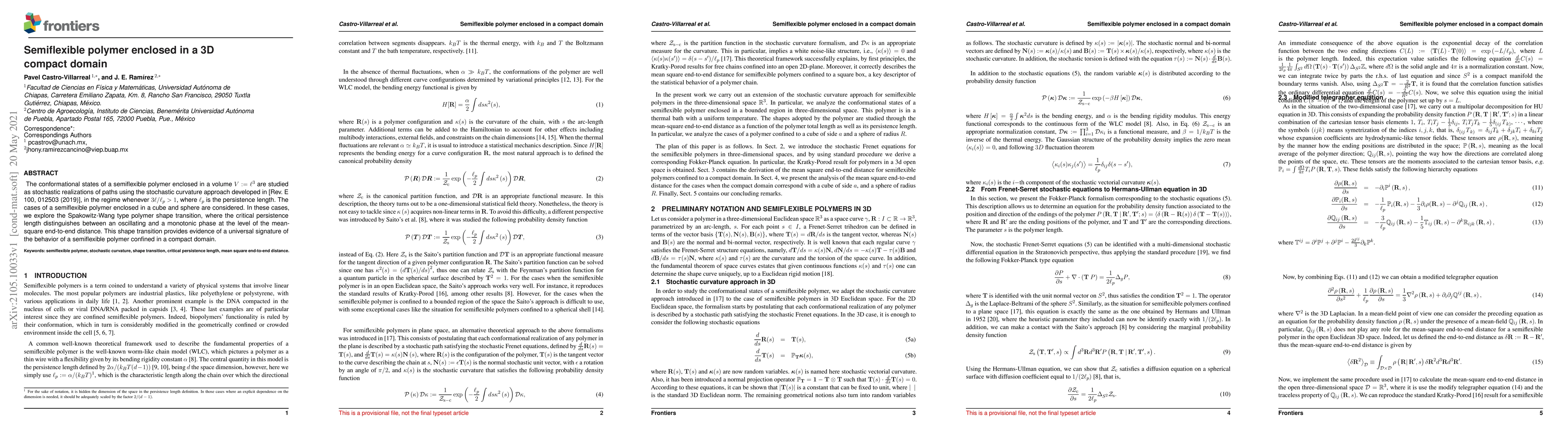 The conformational states of a semiflexible polymer enclosed in a volume $V:=\ell^{3}$ are studied as stochastic realizations of paths using the stochastic curvature approach developed in [Rev. E 100, 012503 (2019)], in the regime whenever $3\ell/\ell_ {p}> 1$, where $\ell_{p}$ is the persistence length. The cases of a semiflexible polymer enclosed in a cube and sphere are considered. In these cases, we explore the Spakowitz-Wang type polymer shape transition, where the critical persistence length distinguishes between an oscillating and a monotonic phase at the level of the mean-square end-to-end distance. This shape transition provides evidence of a universal signature of the behavior of a semiflexible polymer confined in a compact domain.