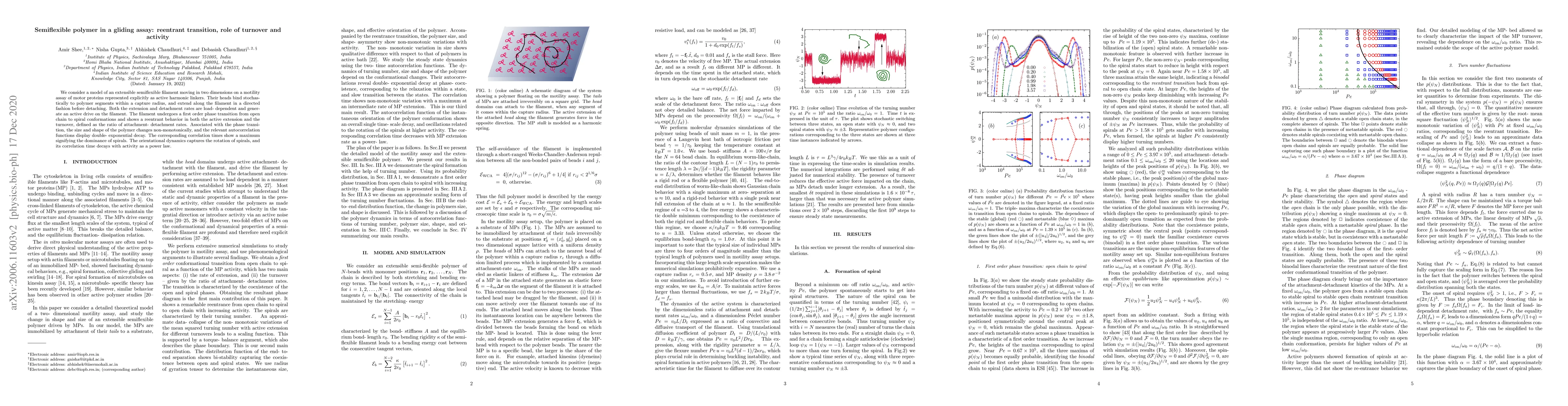 This research explores a semiflexible polymer's behavior in a gliding assay driven by motor proteins, revealing a reentrant transition from open chain to spiral conformations. The study highlights the non-monotonic changes in polymer size and shape and the double-exponential decay in relevant autocorrelation functions, indicating the dominance of spirals.