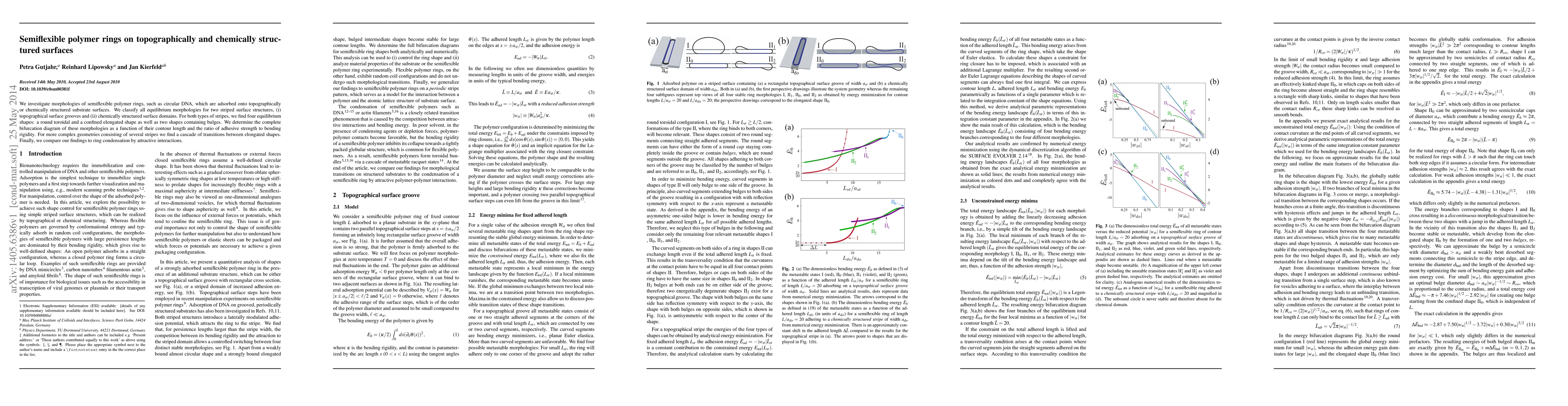 This paper investigates the equilibrium morphologies of semiflexible polymer rings, like circular DNA, on structured surfaces, identifying four distinct shapes influenced by surface topography and chemistry. The study maps out the bifurcation diagram for these shapes based on polymer length and adhesive strength, revealing transitions between elongated forms on complex geometries.