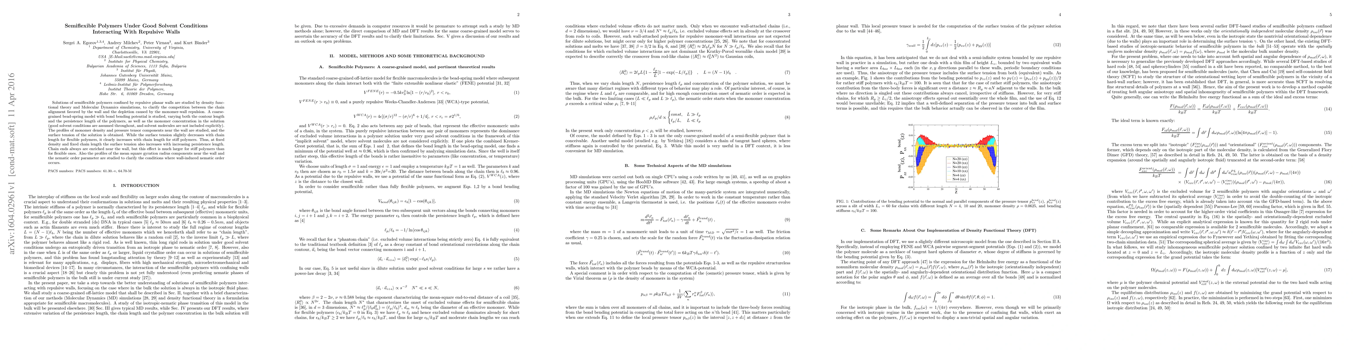 This study uses density functional theory and Molecular Dynamics simulations to investigate semiflexible polymers in good solvent conditions near repulsive walls, focusing on the interplay between wall-induced alignment and monomer-wall repulsion. Results show that surface tension increases with polymer stiffness, and chain ends are more enriched near the wall for stiffer polymers, while nematic order is influenced by polymer persistence length.