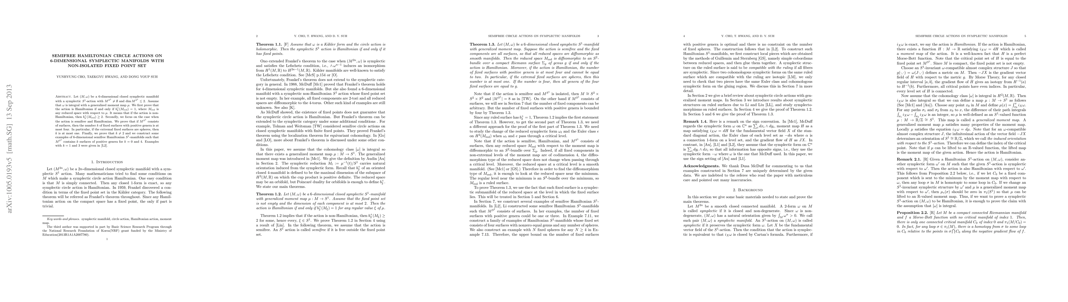 Let $(M, \omega)$ be a 6-dimensional closed symplectic manifold with a symplectic $S^1$-action with $M^{S^1} \neq \emptyset$ and $\dim M^{S^1} \leq 2$. Assume that $\omega$ is integral with a generalized moment map $\mu$. We first prove that the action is Hamiltonian if and only if $b_2^+(M_{\red})=1$, where $M_{\red}$ is any reduced space with respect to $\mu$. It means that if the action is non-Hamiltonian, then $b_2^+(M_{\red}) \geq 2$. Secondly, we focus on the case when the action is semifree and Hamiltonian. We prove that if $M^{S^1}$ consists of surfaces, then the number $k$ of fixed surfaces with positive genera is at most four. In particular, if the extremal fixed surfaces are spheres, then $k$ is at most one. Finally, we prove that $k \neq 2$ and we construct some examples of 6-dimensional semifree Hamiltonian $S^1$-manifolds such that $M^{S^1}$ contains $k$ surfaces of positive genera for $k = 0$ and 4. Examples with $k=1$ and 3 were given in \cite{L2}.