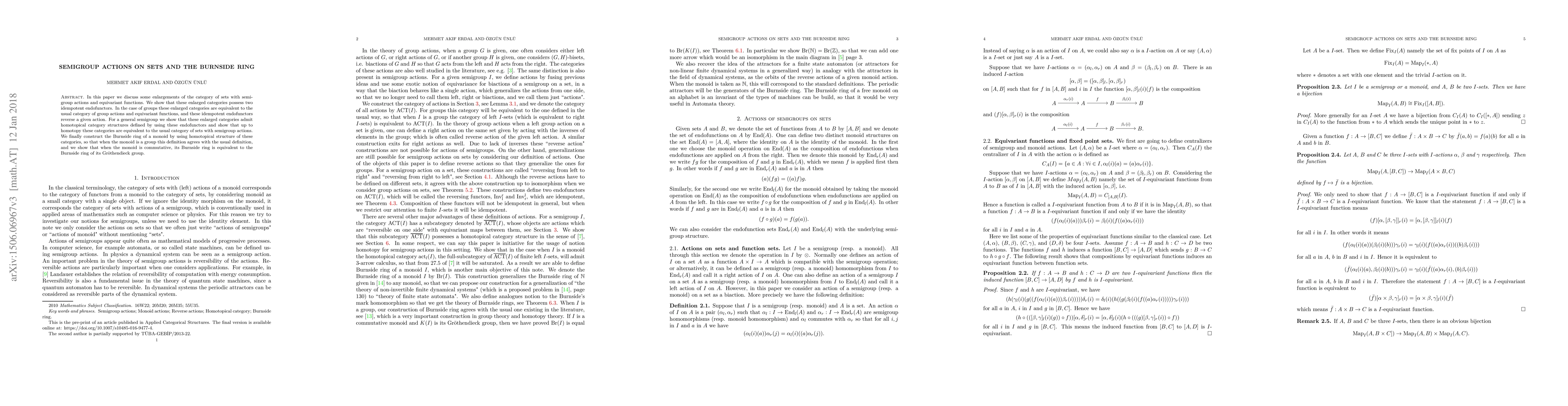 In this paper we discuss some enlargements of the category of sets with semigroup actions and equivariant functions. We show that these enlarged categories possess two idempotent endofunctors. In the case of groups these enlarged categories are equivalent to the usual category of group actions and equivariant functions, and these idempotent endofunctors reverse a given action. For a general semigroup we show that these enlarged categories admit homotopical category structures defined by using these endofunctors and show that up to homotopy these categories are equivalent to the usual category of sets with semigroup actions. We finally construct the Burnside ring of a monoid by using homotopical structure of these categories, so that when the monoid is a group this definition agrees with the usual definition, and we show that when the monoid is commutative, its Burnside ring is equivalent to the Burnside ring of its Gr\"othendieck group.