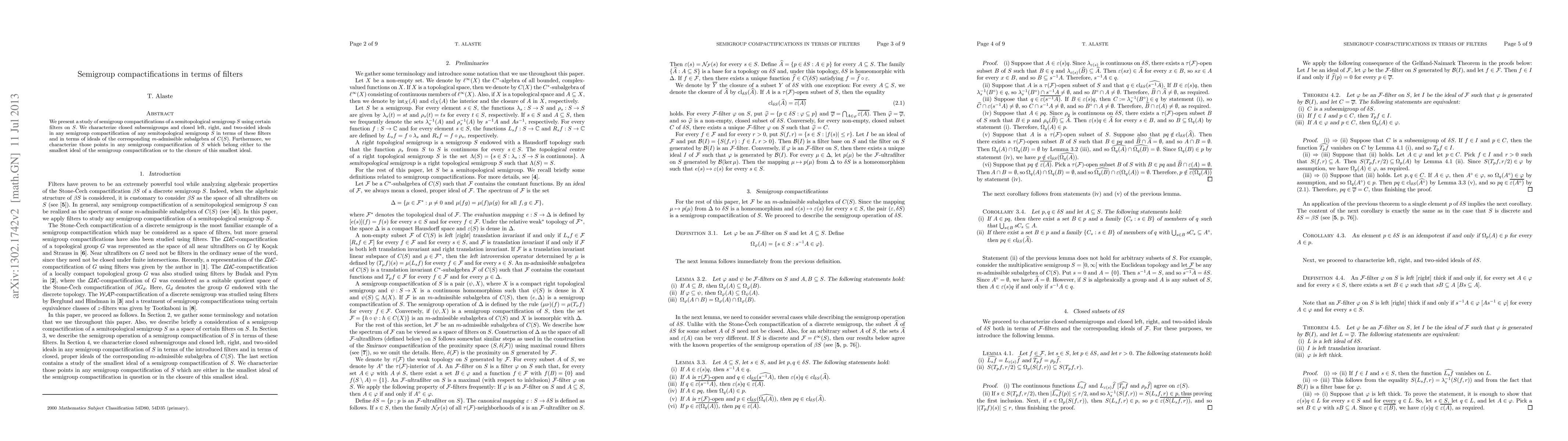This paper explores semigroup compactifications of semitopological semigroups $S$ using filters, characterizing closed subsemigroups and ideals in terms of these filters and $m$-admissible subalgebras. It also identifies points belonging to the smallest ideal or its closure in any semigroup compactification.