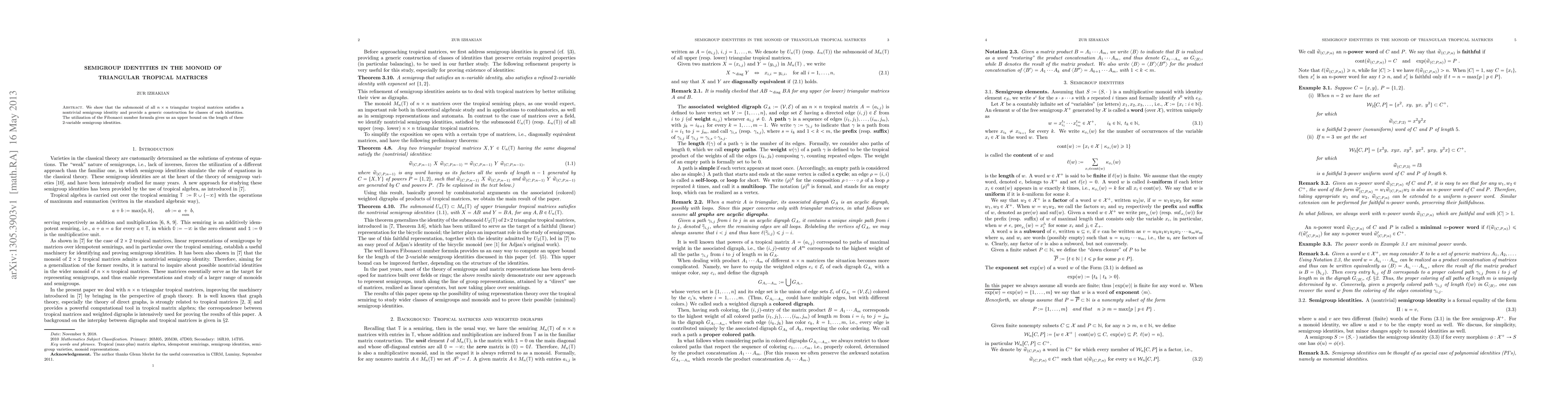 We show that the submonoid of all nxn triangular tropical matrices satisfies a nontrivial semigroup identity and provide a generic construction for classes of such identities. The utilization of the Fibonacci number formula gives us an upper bound on the length of these 2-variable semigroup identities.
