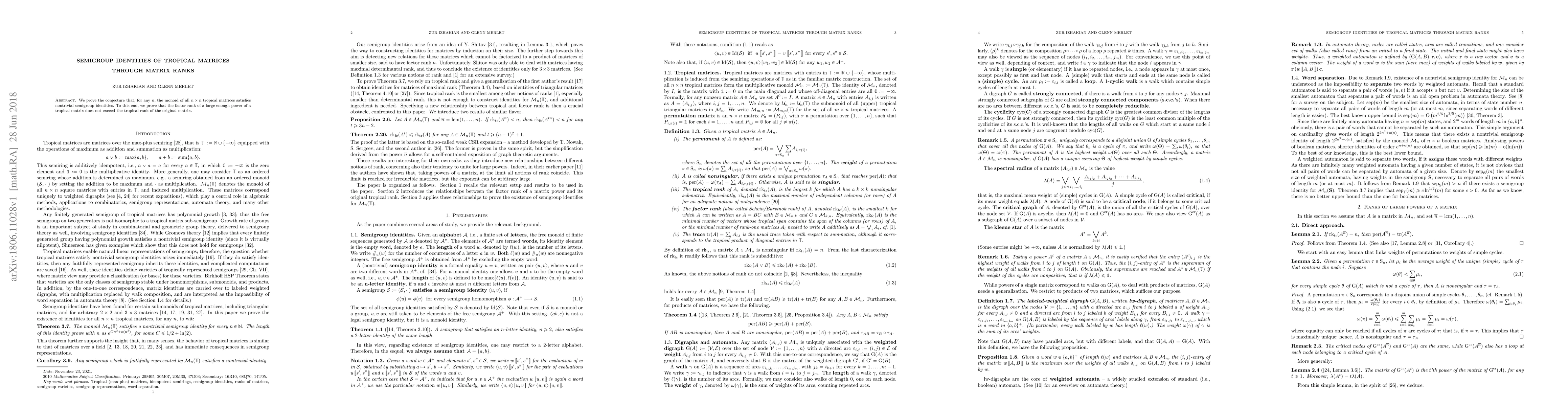 This paper proves the conjecture that the monoid of all $n \times n$ tropical matrices has nontrivial semigroup identities. It demonstrates that the factor rank of sufficiently high powers of a tropical matrix does not exceed the tropical rank of the original matrix.